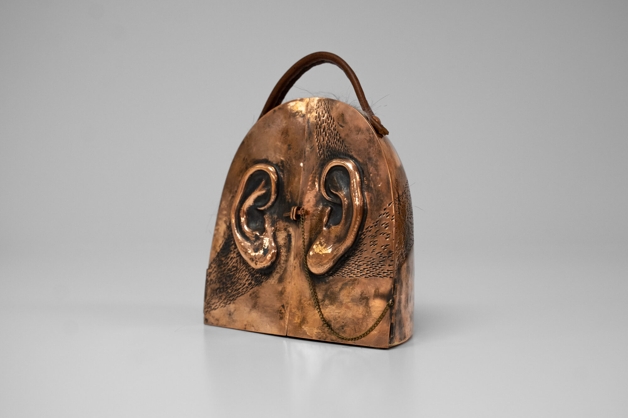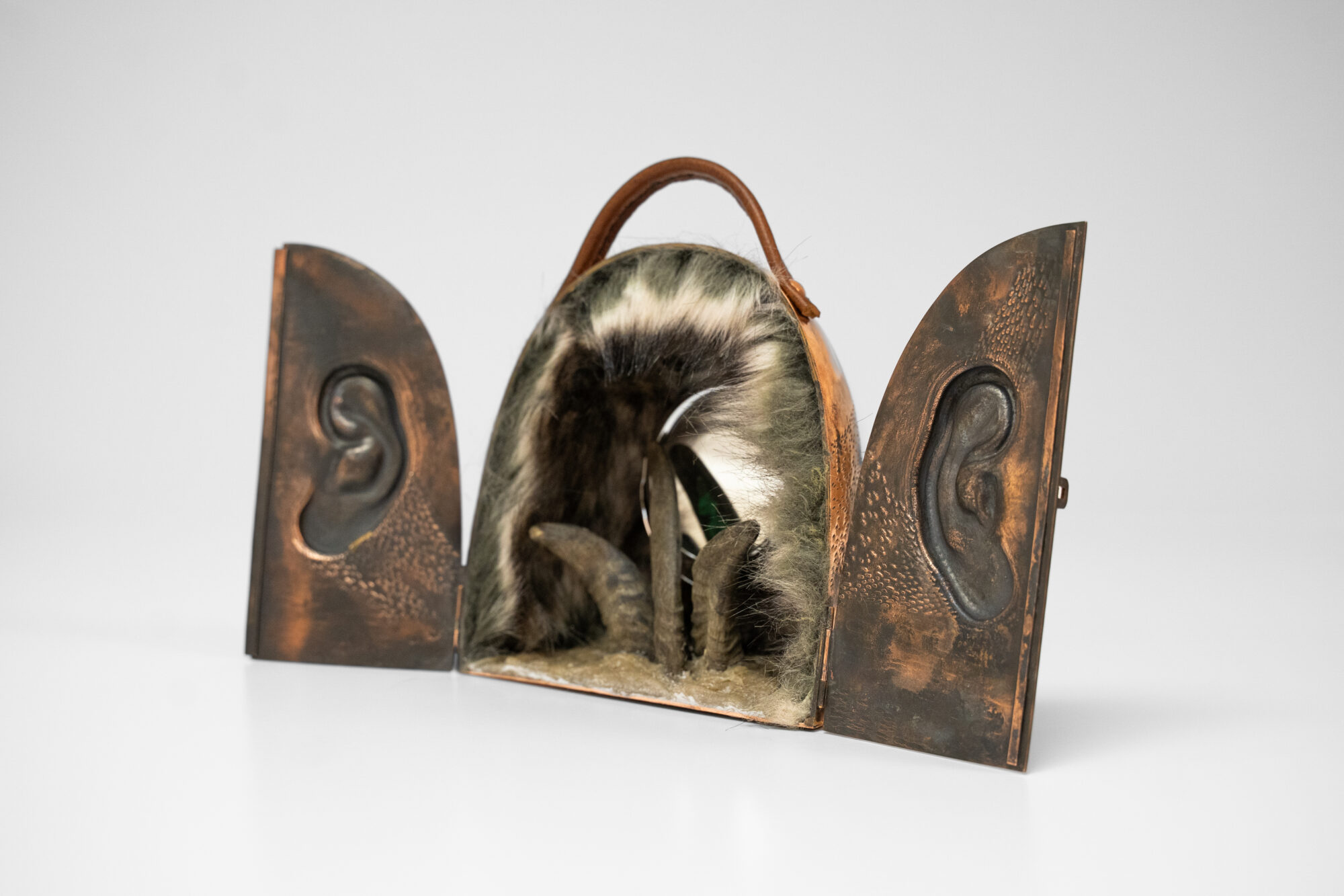Jantsankhorol Erdenebayar has created Channeling our human energy for the journey ahead, 2025, an object he describes as a “travel kit,” featuring a copper outer shell adorned with imagery of human ears and an interior outfitted with faux fur, a mirror, and goat horns. Erdenebayar’s practice spans sculpture, video and performance, drawing from Mongolian mythology and exploring themes of resistance, protection, and survival. For the Aldrich Box, Erdenebayar focused on the concept of nomadism—a foundation of Mongolian culture and ancestral traditions—symbolizing a profound connection to the natural world. By transforming the museum visitor into a traveler, Erdenebayar’s object has been reimagined as a “treasure purse,” shrine, or shamanistic tool. Equipped with a handle to suggest its portability, its reflective copper surface alludes to Mongolia’s significant copper industry. The goat horns inside evoke movement, strength, and protection, while the mirror serves not only as a tool for self-reflection, but also as a symbolic portal to the spirit realm.
