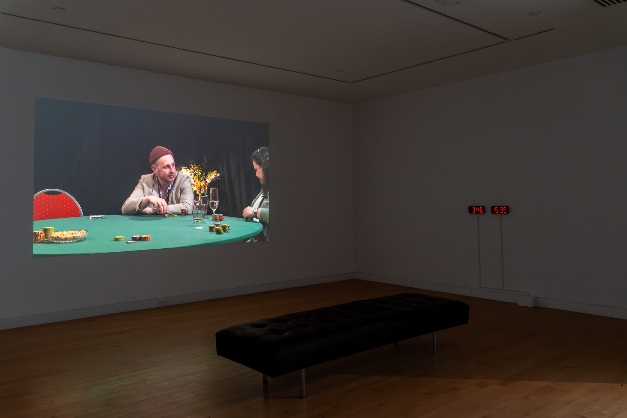 In Table Games, 2021, six characters are playing poker. They played for real money which the winner received at the end of the performance. Each player was given a score of gestures, sentences and actions that they activate over the course of the game. Initially live-streamed, Richardson McCrea and her collaborator, Nina Nadig, live-edited the four camera recordings over the course of the seven hours.