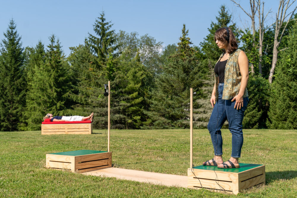 The soapbox sculptures take several distinctive forms including an ADA soapbox that is fully wheelchair and stroller accessible, a two-person soapbox for collective listening and dialogue, a daybed soapbox for visitors to recline upon and politically imagine, and an individual soapbox. Each soapbox sculpture includes headphones which emit an evolving oral archive of responses to the project’s questions recorded by visitors. At the time of this project’s installation at The Aldrich, the audio will include responses from the project’s former installation locations at the Queens Museum in New York City (October 2, 2021 to February 13, 2022) and the Yerba Buena Center for the Arts in San Francisco, CA (October 20, 2022 to March 12, 2023). Visitor responses will be collected and added to the project’s oral archive to be shared in future installations. Following the presentation at The Aldrich, the installation will travel to Project Row Houses in Houston, TX.