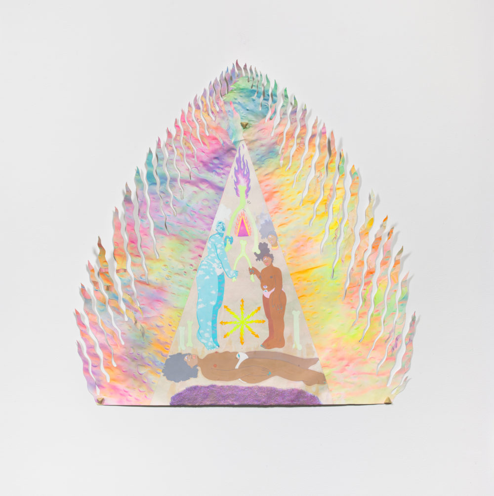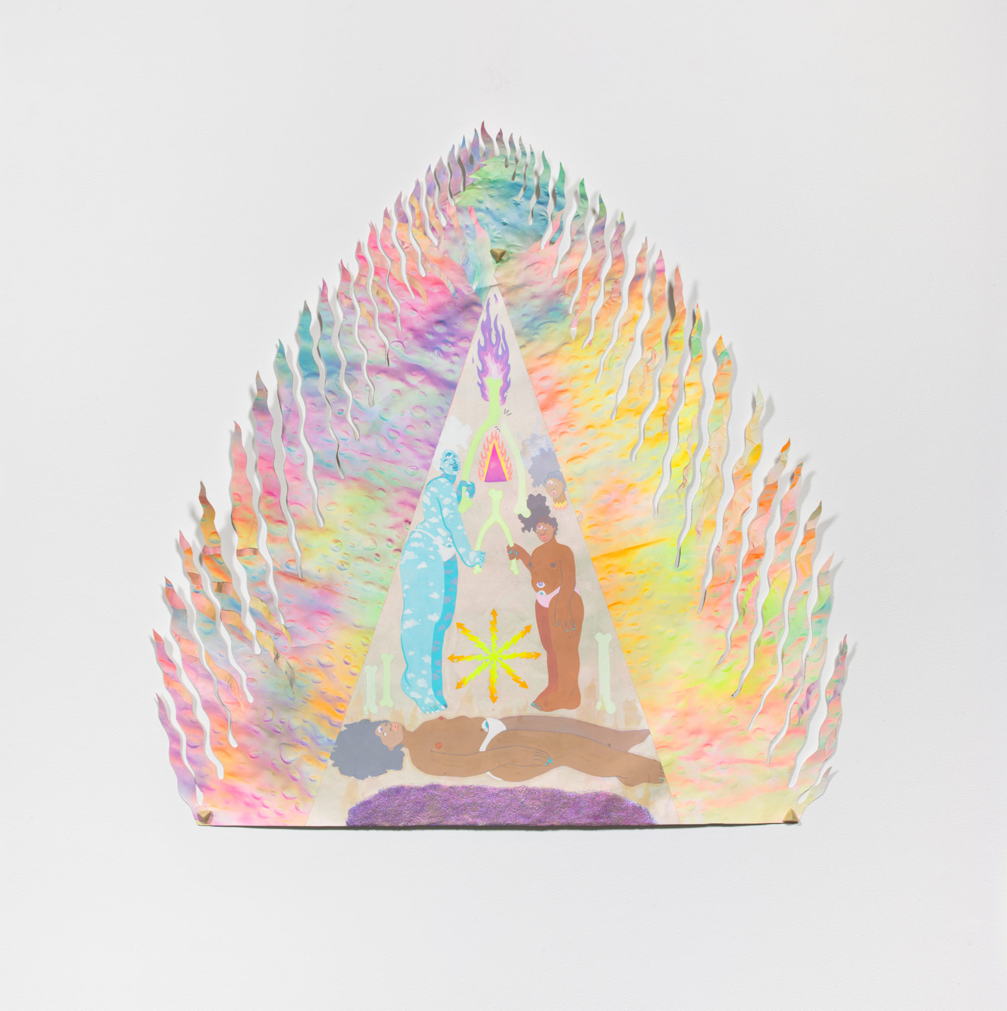 Graduation Day is a monumental drawing and collage on paper. It depicts a volcano erupting a rainbow inferno. Inside a triangular-shaped grotto a figure levitates above a shadowy portal. Two spirit beings, one an iridescent blue and the other a fluorescent brown, hover over the reposing body. They each clench one end of a wishbone, a symbol of untapped potential. A pink triangle blazes, snapping the wishbone, and releasing a purple flame that burns and shimmers with beaming optimism.