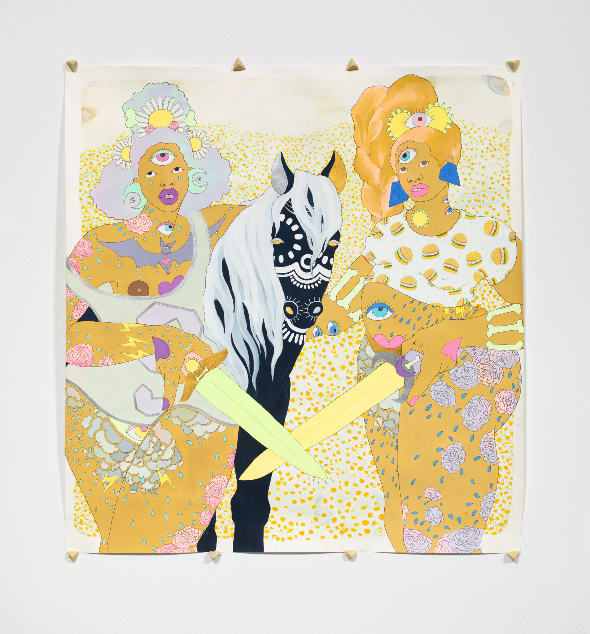 The Guardians is a large gouache and tea drawing on paper. It portrays a pair of protectors with outsized bellies brandishing bone swords in the company of a dark horse. Within a field of chamomile, they stand guard. Each is heavily adorned and tattooed with symbols of strength, abundance, nourishment, and passage.