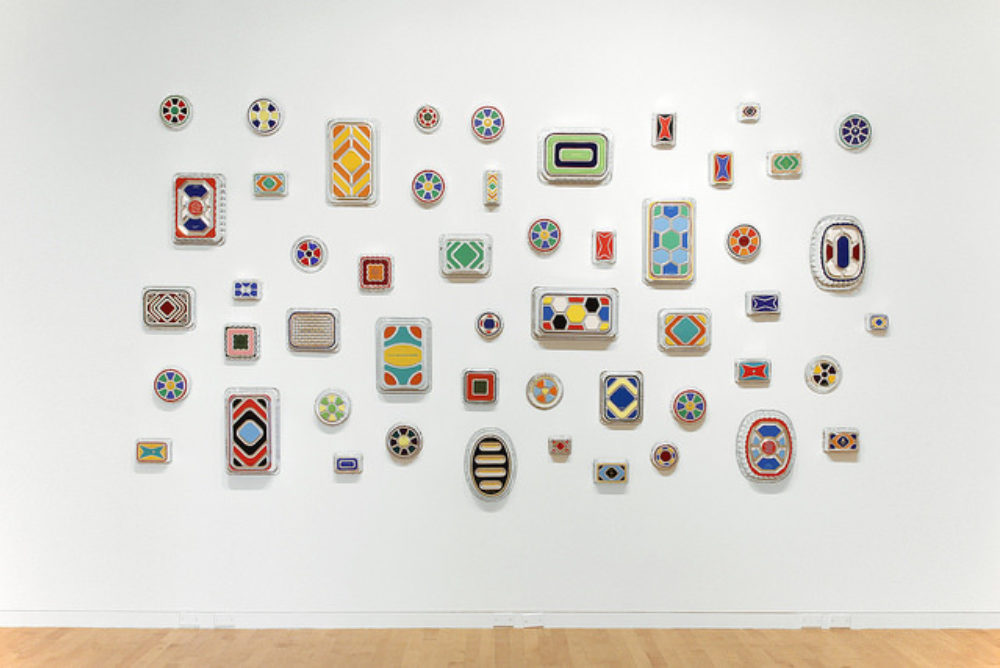 Since 1990, Wurtz has produced an ongoing body of work that he refers to as “pan paintings.” These wall pieces are made from ordinary aluminum food containers and roasting pans purchased at grocery or variety stores. These inexpensive and disposable pans transcend socio-economic class, passing through every home; but by painting over the patterns and texts on the exterior of the pans with various colors of acrylic paint, Wurtz has transformed the ordinary into something invaluable. For The Aldrich, he covers three walls of the Erna D. Leir Gallery, salon style, with over 200 of his pan paintings dating from 1991 to 2015. Appearing like geometric abstractions, their compositions are predetermined not by Wurtz, but by a nameless maker, as he accentuates the full range of their embossed designs. Alongside his own works, on a long shelf, Wurtz presents a collection of common domestic objects he’s been acquiring over the years from second-hand shops and eBay. The objects—from American Brilliant cut glassware to Wedgwood pottery and mid-century Danish modern Krenit bowls—represent a number of distinctive styles and periods, and have no immediate connection to each other. In bringing them together, Wurtz offers up a compelling dialogue about high art, decorative art, form and function, as well as the act of collecting.