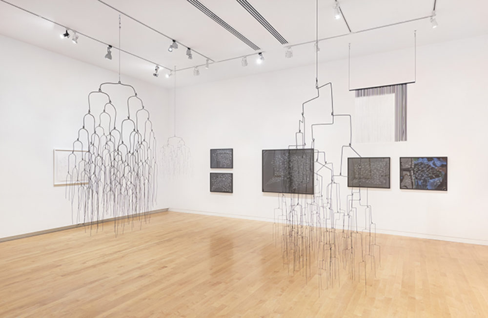 In 1998, Campbell introduced her now-acclaimed Potential Future Drawings series, channeling the Surrealists to give tangible shape to interior monologues. She begins with an event in her own life, and then uses a diagrammatic system to create a latticework of potential outcomes from the most wanted to the most devastating. Campbell mirrors our inward desire for mass acceptance and wide success, while also tapping into our general fear of ultimate failure and crushing embarrassment. The mobiles inspired by the formal acceptance of these mind maps, and appear like chandeliers, or vascular or root systems, function as abstract drawings in space as seen in My Mother’s House (2016). Comprised of bent steel and wire, some in taut primary colors, they vary in size—from body size to architecturally scaled—and cast shadows and create pulsating optical patterns that mime the circulatory matrix of her drawings. The Future Past Drawings series, initiated in 2014, includes the newest work in the exhibition. All the drawings in this series are on black paper and, like the Potential Future Drawings, they operate as a flowing feed; reflecting back and looking forward, they conflate personal and historical experience, in the end considering how subjectivity reshapes the past to condition the future.