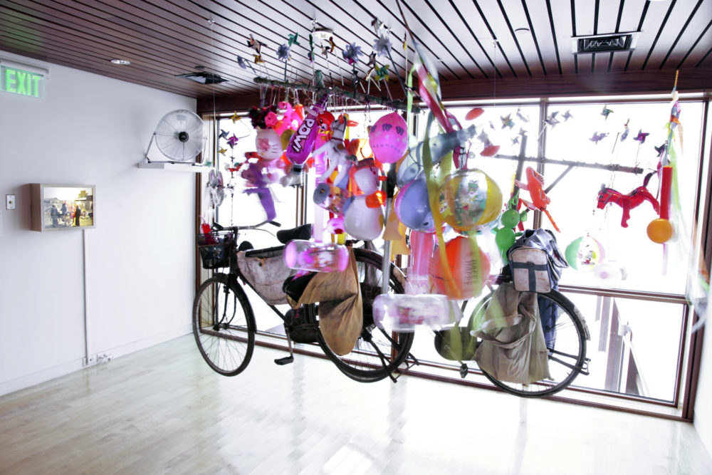 In countries like China and India, bicycles play a prominent role in the informal economy. In China, bicycles have taken on the importance of an intimate partner in the daily lives of tens of thousands of local people. In the country that proclaims itself a “kingdom of bicycles,” the number of bicyclists was once reported to be as high as 500 million,[3] and many of them acted as mobile street vendors. Cai Guo-Qiang’s installation, Illusion of Childhood, presents a couple of suspended bicycles that the artist purchased from two inflatable-toy vendors in his hometown of Quanzhou, along with a light box displaying photo documentation of the transaction. The installation is a poetic rumination on the artist’s fleeting childhood fantasies and memories. Indeed, the burst of vibrant colors and swaying of the balloons and other inflatable toys trigger flashes of freedom, joy, and desire. Their beauty is but a mirage, and such tantalizing merchandise stands in clear contrast to the earthy, run-down bicycles of the improvising vendors. In this artwork, the innocence of youth and the spoils of time give way to illusions of time and latitude over countless years.