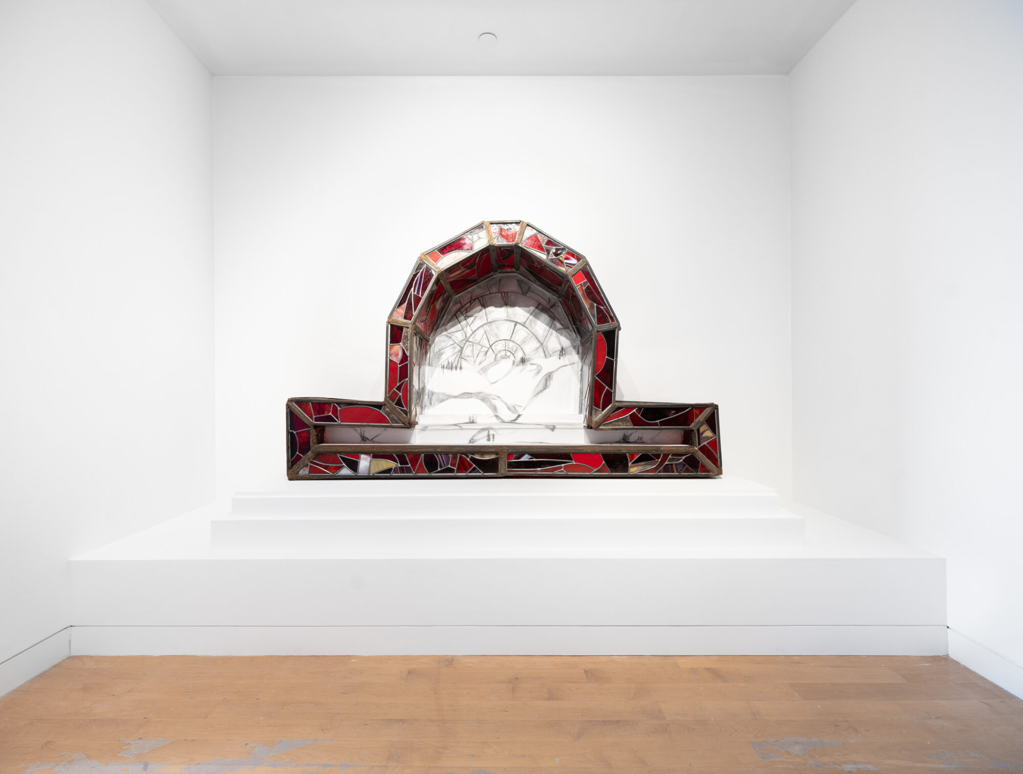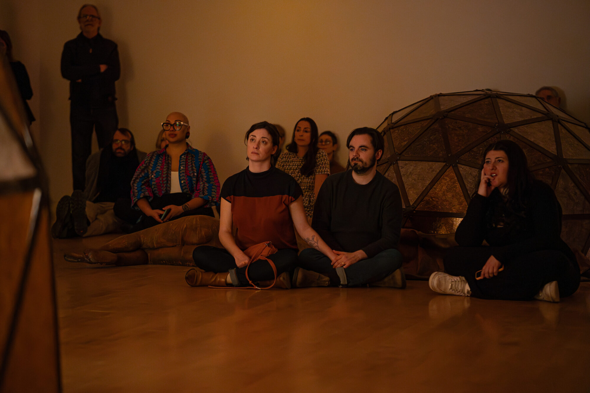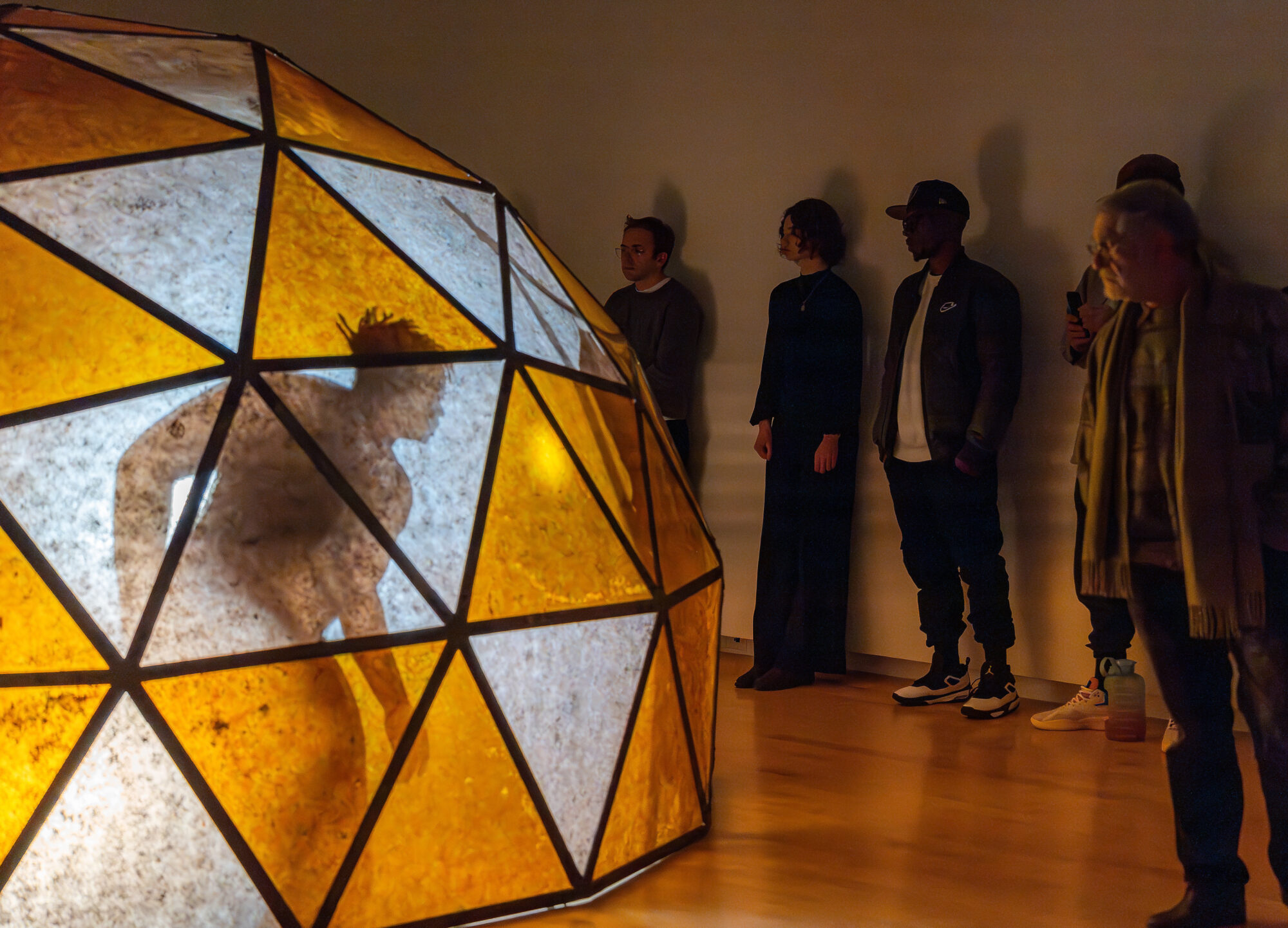 On Saturday, February 3 Chiffon Thomas performed Polish, an hour-long performance in the Museum's South Gallery. The performance took place inside the artist’s exhibition, The Cavernous, where Thomas performed inside his capacious sculpture, Untitled (Dome, Figure 1), which he outfitted with a miniaturized hatch. Turning his sculpture into a vessel or portal to an undetermined landscape, the artist enacted a series of choreographed movements timed to percussive sound and orchestrated lighting to guide healing, passage, and regeneration.