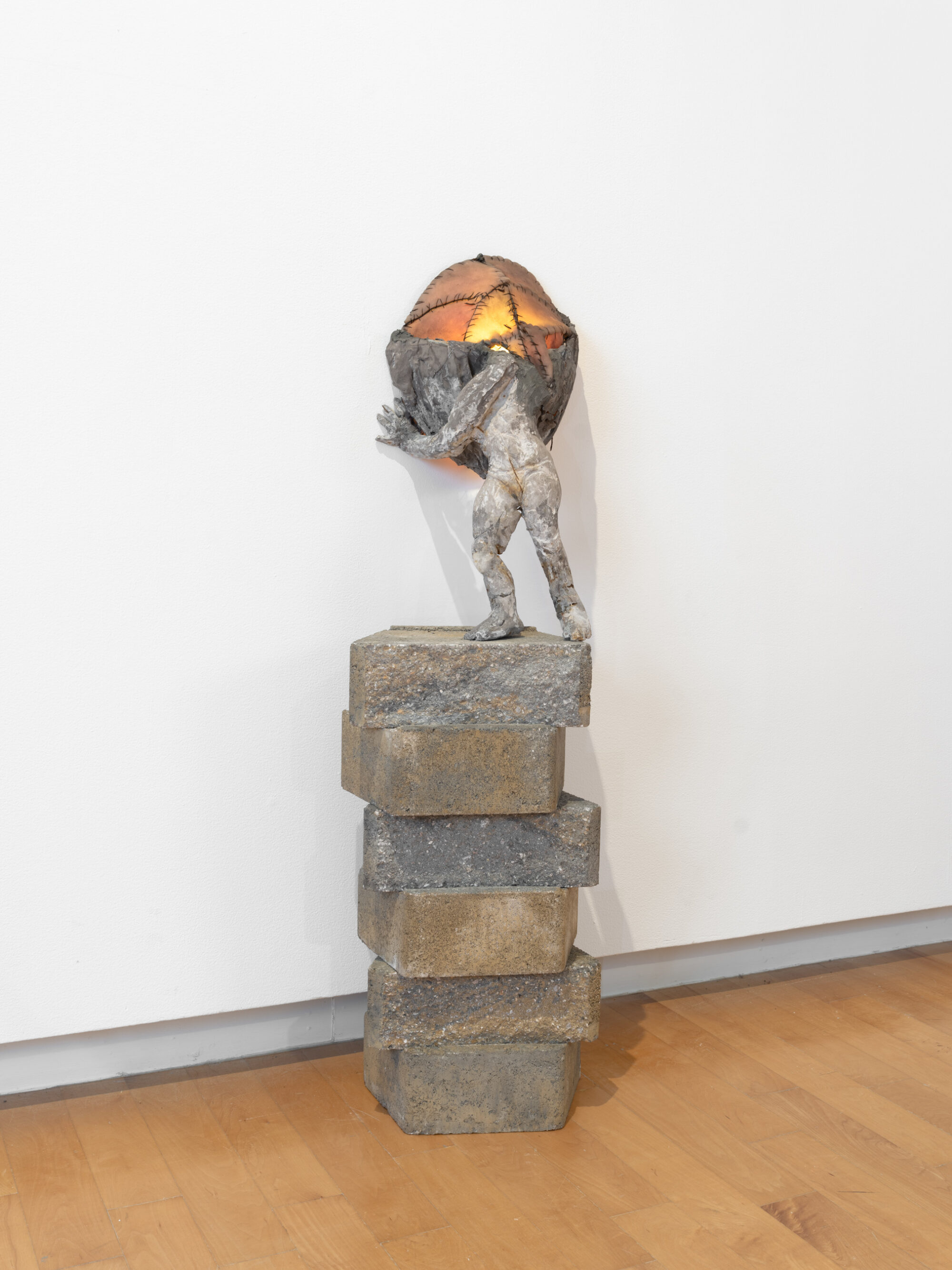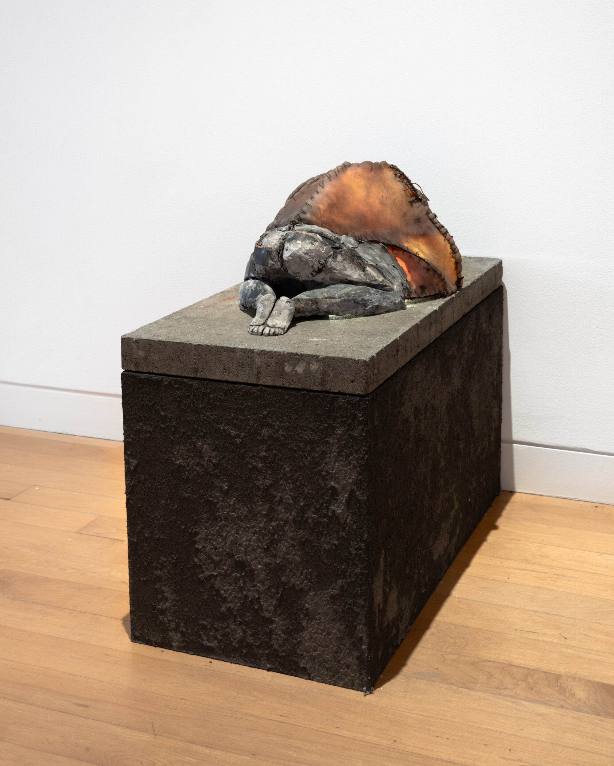 The exhibition features drawings and sculptures at varying sizes and tempos, including Thomas’ largest works to date and latest experimentations with new materials and fabrication methods. The centerpieces of the exhibition are three monumental sculptures, installed inside the galleries and on the Museum’s grounds. Each combines life-size fiberglass casts of a human body, weathered to appear almost sunbaked, with geodesic domes of steel and mica that appear illuminated. The solitary figure, cast in recumbent and seated postures, appears entangled, interned, and engulfed by the immersive domes’ dense matrix of triangular planes. Twentieth-century American architect, engineer, and futurist R. Buckminster Fuller (1895-1983) received a patent for the geodesic dome in 1954 as his solution to the then ballooning housing crisis. Its novel design, although futuristic and environmentally efficient, never caught on in part due to a far-off appearance and challenging internal blueprint. Surveying the relationship between the structural efficiency of the human body and Fuller’s utopian vision, Thomas bridges figuration with engineering, foreseeing a machine being or what he refers to as an “impossible body.”