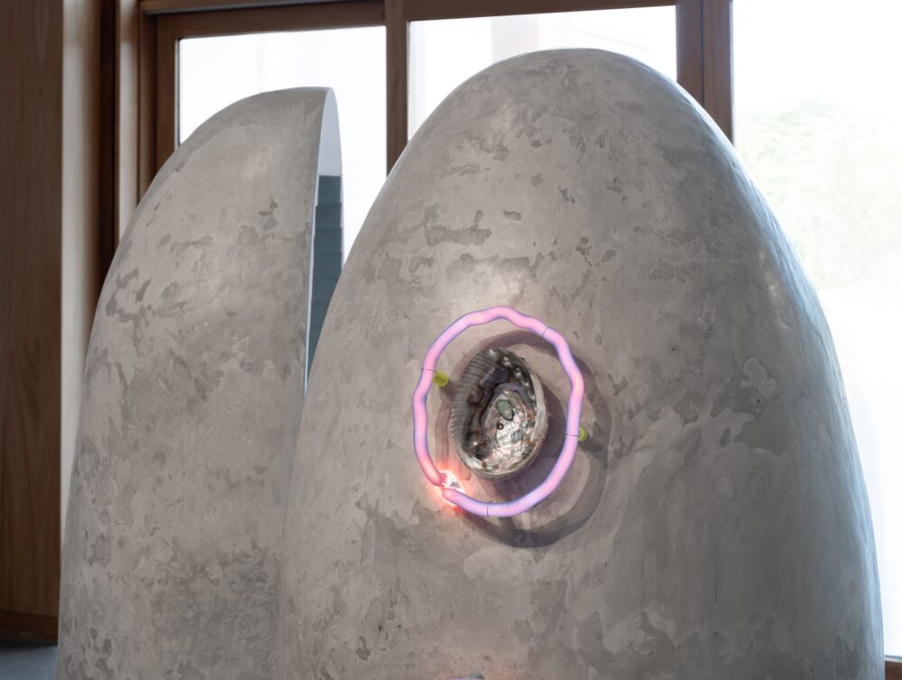 Top image: Esther Ruiz, COMMU-1 (Navigational Beacon), 2024, Neon, aquamarine blue glass, phosphor, Abalone, moon snail shell, smoky quartz, rainbow aura quartz, acrylic, steel, epoxy clay, transformer, MDF, cement, gypsum, paint, 72 x 26 x 16 inches each. Courtesy of the artist. Photo: Jason Mandella