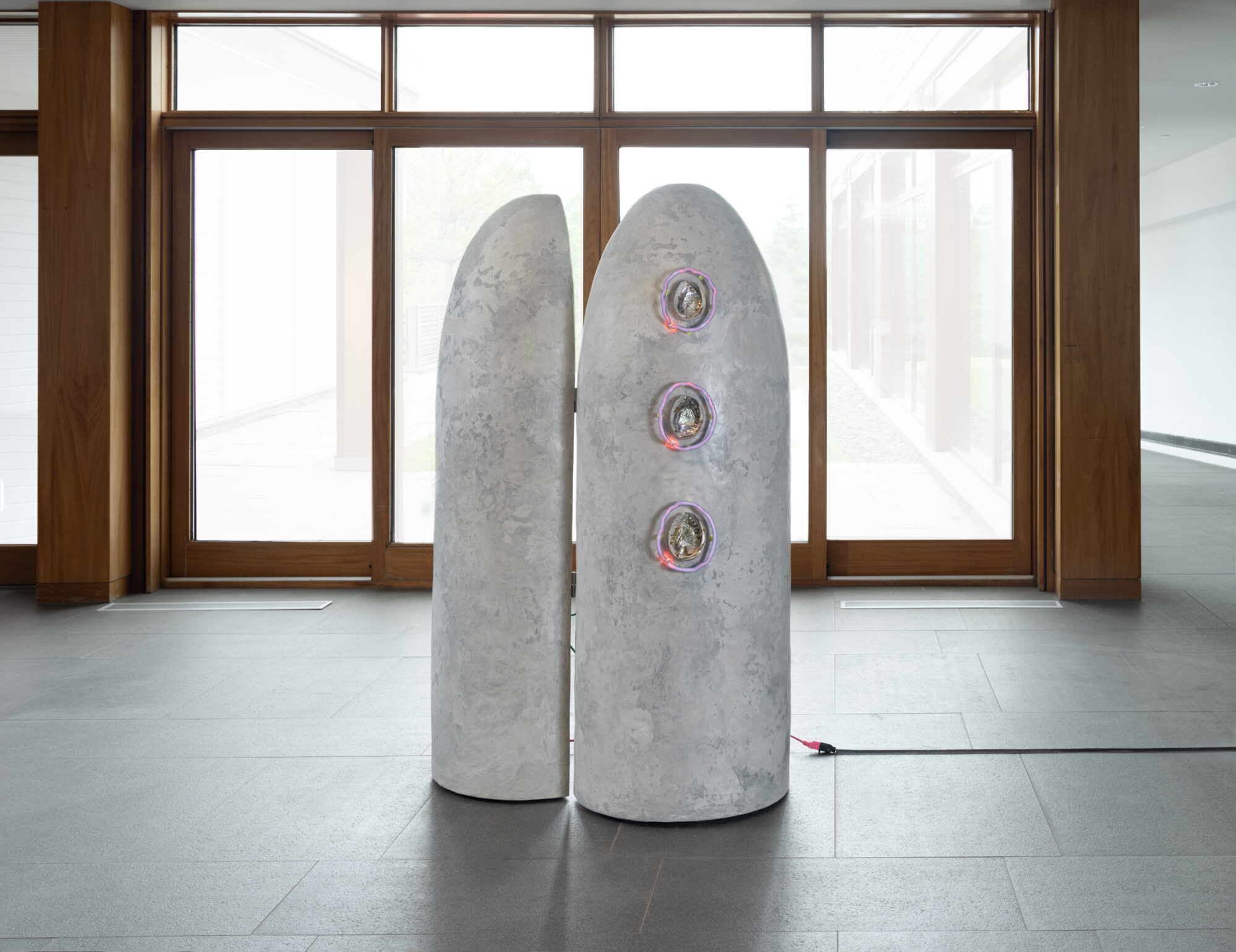 For Uncharted, Ruiz has also created COMMU-1 Navigational Beacon, the first freestanding sculpture and the largest to date in the Beacon series. Standing at nearly six feet tall, COMMU-1 is a human-scaled capsule described by the artist as a “chamber for contemplation.” Comprised of hinged halves, the pod’s life force—wires, transformers, implanted crystals, terrestrial samples—is exposed to showcase the vessel’s power supply. Sewn to the fuselage’s exterior with steel wire are three large abalone shells surrounded by Phosphor-coated cobalt glass tubes filled with neon. At its core, COMMU-1 conjures the spirit of exploration and meditation, sharing with the other Beacons the manifestation of Ruiz’s intuition—a collision of the earthly and the boundless.