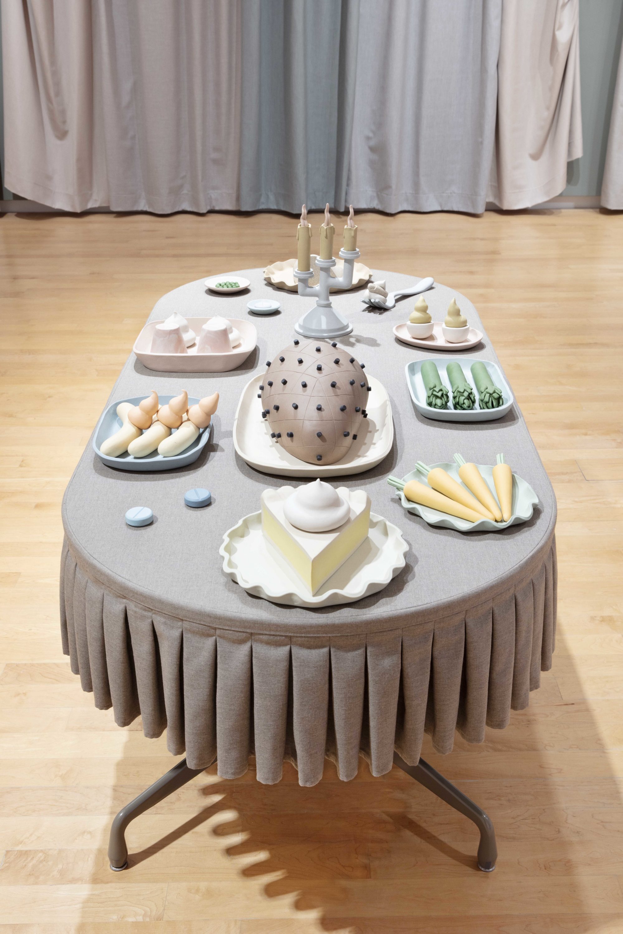 Through the Eye of a Needle is the first major solo museum exhibition of New York-based artist Genesis Belanger (b. 1978), whose practice spans sculptures and tableaux, primarily composed out of porcelain, stoneware, and upholstery. Anthropomorphizing common household objects--lipsticks with wagging tongues, lamps with ladies' pearls, and tins with doey-eyed sardines--Belanger's methodology blends Surrealism and Pop art with a self-possessed feminism informed by a career inside the fashion and advertising industries. Debuting an entirely new body of work specially conceived for The Aldrich, Belanger will create her largest and most elaborate mise-en-scène to date: dozens of animated objects arranged on ghostly furnishings that suggest narratives about our anxiety afflicted present. The artist's first museum publication, featuring an essay by the exhibition's curator, Amy Smith-Stewart, will accompany the show.