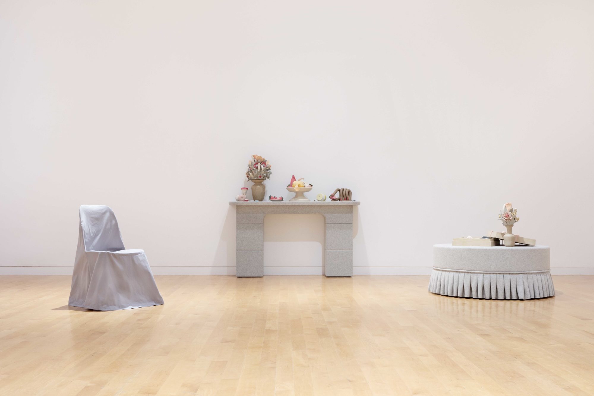There’s always something slightly unnerving about Genesis Belanger’s sculptures. Her tableaux of furniture and ceramics, with their crisp edges, soft, buttery textures, and dusty pink and tan hues, are spiked with a sharp, humorous bite.