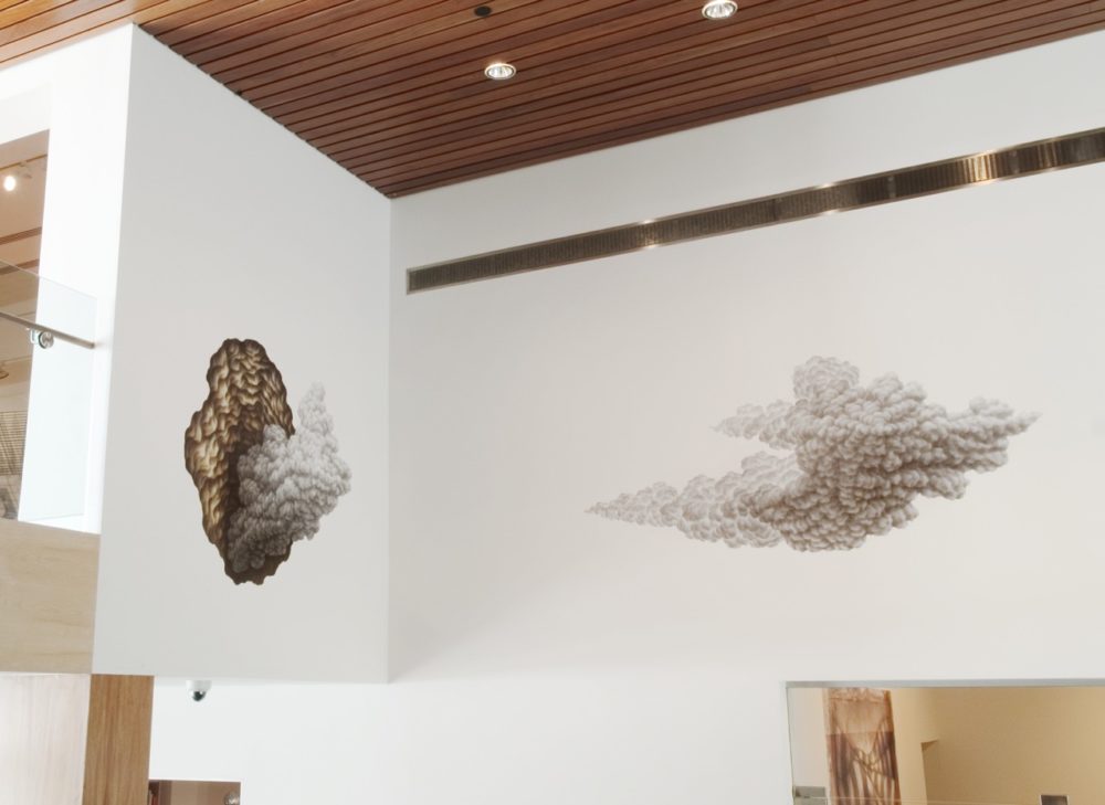 Surrounding the viewer from floor to ceiling, the images are rendered with dramatic spatial intensity, and take into account the viewer’s physical viewpoint. Trompe l’oeil caverns seem to puncture or erode some walls, while voluminous plumes of smoke and drifting clouds emerge from others. These visionary fragments of nature test the boundary between reality and artifice as they lure the viewer into their believable yet impossible illusions.