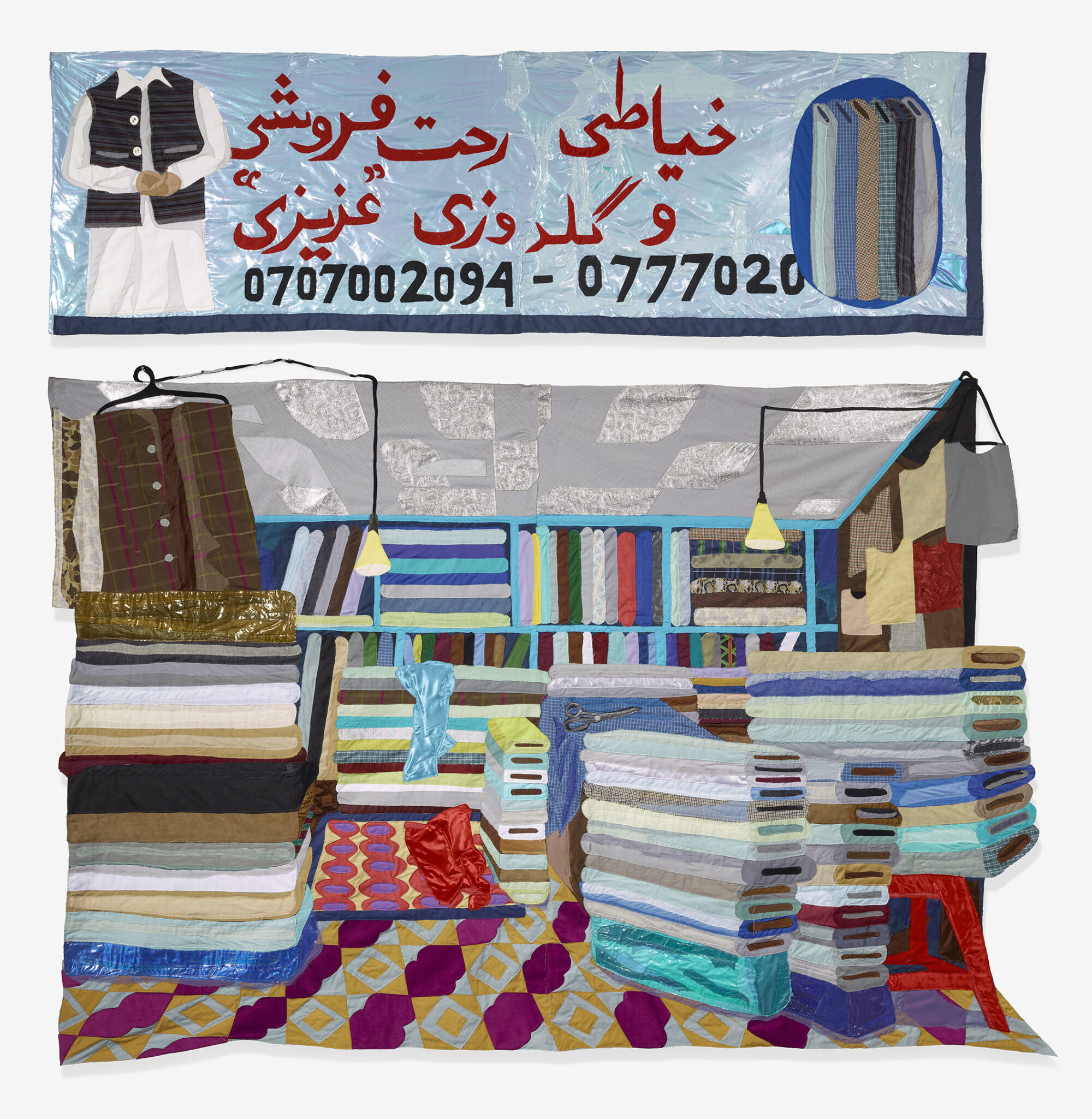 Afghan Canadian artist Hangama Amiri combines painting and printmaking techniques with textiles, weaving together stories based on memories of her homeland and her diasporic experience. Amiri fled Kabul with her family in 1996 when she was seven years old. Moving through numerous countries over several years, they immigrated to Canada in 2005 when Amiri was a teenager. Amiri’s choice of materials stems from autobiographical origins—her mother taught her to sew and her uncle was a tailor. Her textiles also reference the colors and fabrics she remembers in the bazaars and on the streets in Kabul. She sources her materials from an Afghan-owned shop in New York City’s fashion district, collaging with fabric and painting on the surfaces. Large-scaled with frayed edges, Amiri’s textile works are made from layering fabrics, piecing and sewing them together, so the fragments collectively characterize her home from a distance. Centered on the lives of women, she builds interiors that capture her protagonists within domestic and entrepreneurial spaces and amplify a collective struggle for women’s rights in Afghanistan and around the world.
