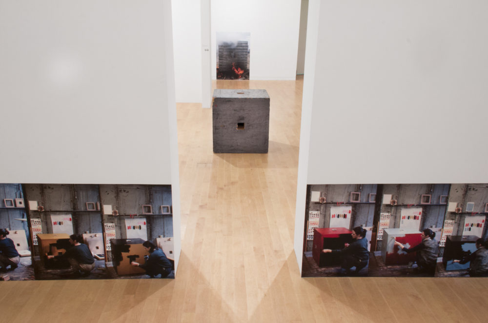 Winsor’s first solo museum exhibition since 1997 opens with a to-scale photograph of Burnt Piece. The artist constructed a wood and concrete cube and set it ablaze, using one of the most potent natural agents, fire, to introduce radical change and risk into the process. The completion of this work by means of a destructive act addresses her interest in unifying the known and the unknown.
