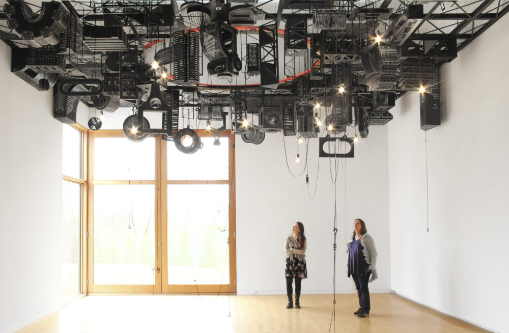 This quote, from Irish theater critic Vivian Mercier’s 1956 review of Samuel Beckett’s famous play, has quietly engaged artist Jane South’s imagination for many years. Her interest in Mercier’s review is extremely pertinent to the understanding ofFloor/Ceiling, the artist’s largest and most ambitious installation to date, and her first to incorporate lighting. South’s work has consistently been informed by her early years in the world of theater set design, particularly the period she spent in the late 1980s working with a company in London that focused almost exclusively on the plays of Beckett. This history has come full circle in the realization of Floor/Ceiling, a work that has two distinctly different acts: the view looking up from the Museum’s ground floor Project Space and the view looking down from the second floor Balcony Gallery.
