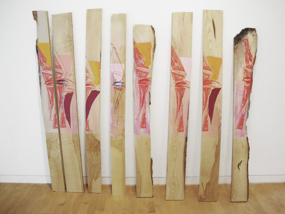 In 2009 an ailing, 125-year-old American ash tree was cut down in The Aldrich’s Sculpture Garden. It was agreed that the wood should be offered to an artist, and sculptor Jessica Stockholder was invited to utilize it in an exhibition: perhaps surprisingly, as she is well known for ephemeral abstraction, primarily made from synthetic, man-made materials and objects. In this work, she continues to explore how picture-making intersects three dimensions as she muses over the relationship between trees and architecture.