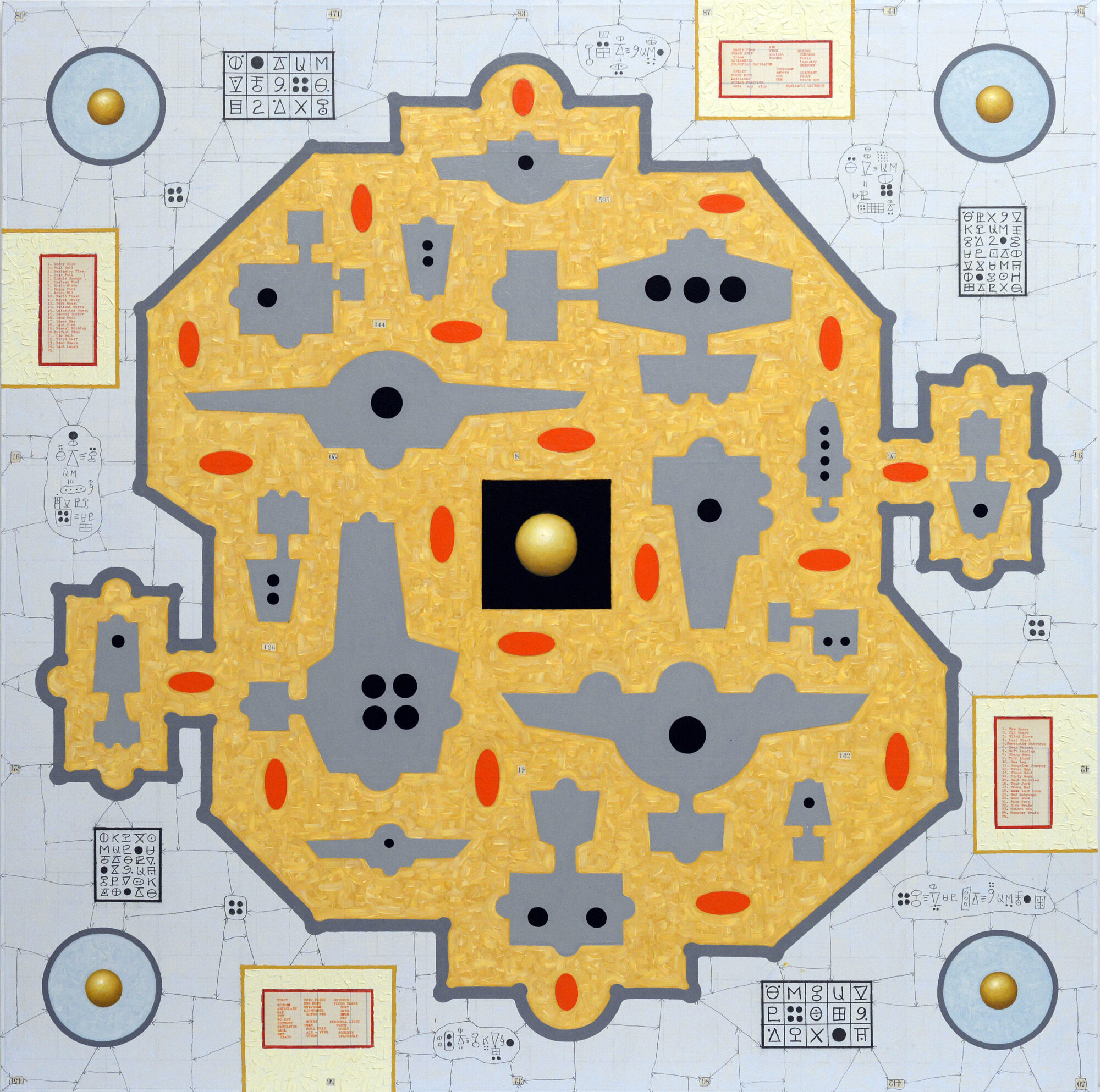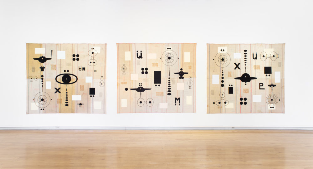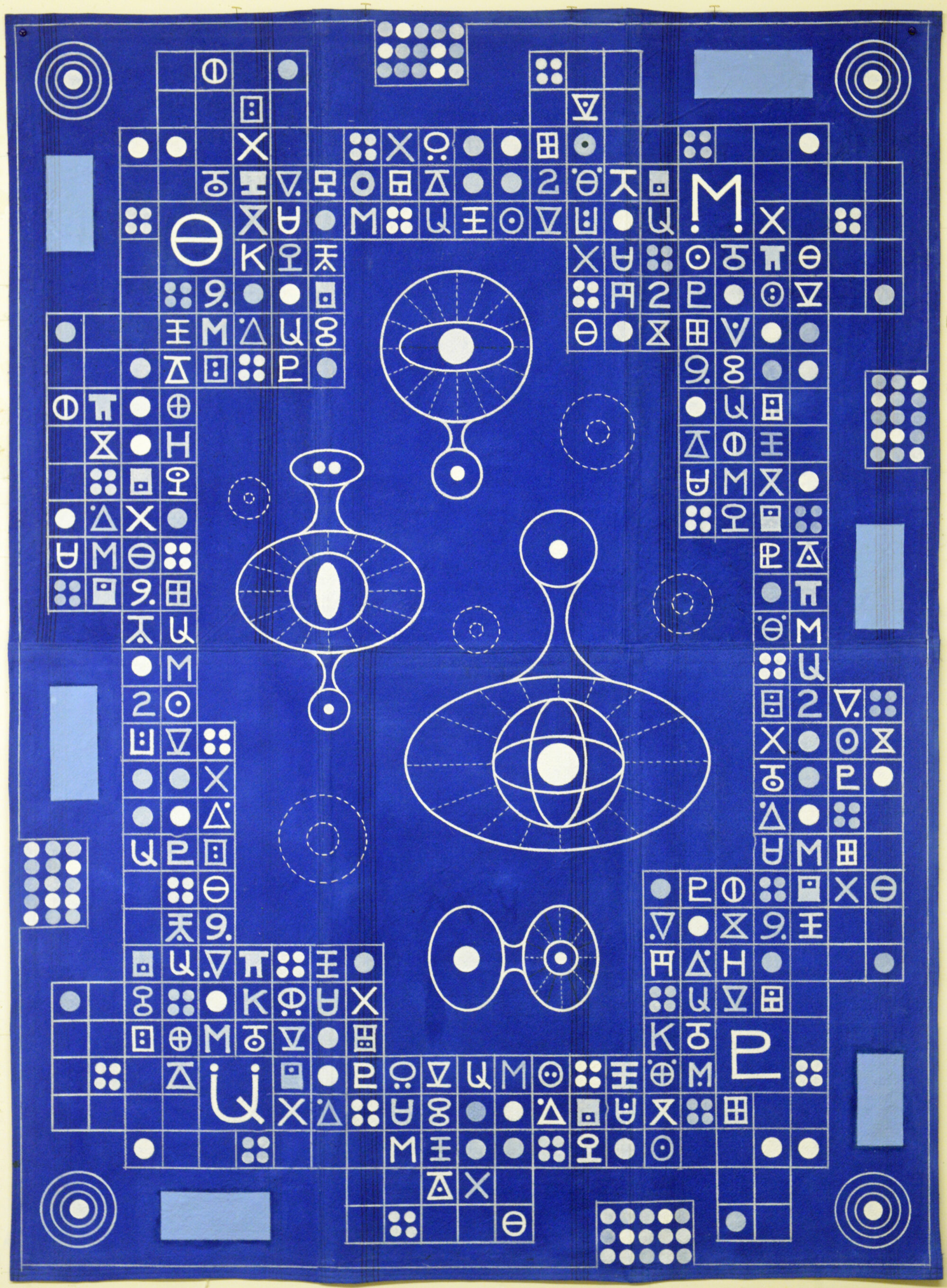 Knight's imagery is steeped in science, the occult, early twentieth century abstraction, Surrealism and Native American art. Her visual language is purposefully impenetrable—she offers no clues or methods to its decoding. For her, its true meaning must remain unnamed, as it is ultimately inspired by “the mysteries and absurdities of life.” Her dense paintings and works on paper swirl with graphic shapes, diagrams, and ciphers that appear both archaic and spaced-aged. The exhibition will track the vast range and evolution of Knight’s pictographic lexicon—the spaceships, floating orbs, and eyeballs, as well as the hieroglyphic-like lists, charts, codes, alphabets, and other invented symbols—that embody these all-over compositions. Similar to the trailblazing abstract artist Hilma af Klint (1862–1944) and the far-sighted symbolist Agnes Pelton (1881–1961), Knight’s enigmatic image databank channels a passionate engagement with spiritual or nonphysical realms. The exhibition will also debut an entirely new series, featuring what Knight refers to as “tapestries.” Using reclaimed cotton cut from circa 1940s–50s seed and grain bags purchased on eBay, Knight sews pieces together to form a patchwork composition. Unstretched, she draws and paints directly on the surface with flashe, colored pencil, and graphite, while hand embroidering select sections.