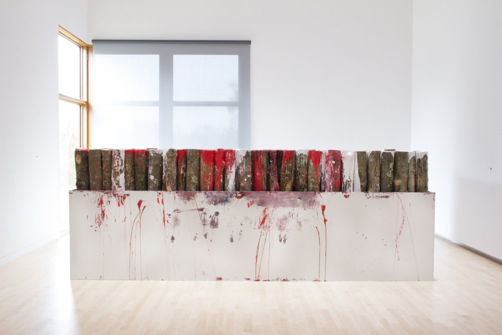 Gilmore debuts A Roll in the Way (2014), a site-specific sculpture and video that is a record of a private performance produced within The Aldrich’s walls. The end result of her actions is a monumental sculpture, a “container” of the performance’s aftermath, comprised of a pile of logs covered in bright paint, on a white platform. The video, shot from an aerial perspective, shows Gilmore stacking logs onto a base designed to exactly fit the camera’s frame. The action unfolds as follows: Gilmore dips logs approximately two feet long with a softball-size diameter in paint and carries and lifts them onto the base, leaving a trace of color that gradually expands as the accumulation of logs increases until it reaches maximum capacity. The paint drips as if the wood bleeds, leaving a trace of the live event that bestows an inanimate object with emotional pathos. The sheer scale of the installation is testament to the incredible physicality of Kate Gilmore’s practice. The bodily force exerted and the sculpture’s immensity and site-specificity recall the infinitives Richard Serra used to describe his artistic process: “to drop,” “to roll,” and “to splash.”