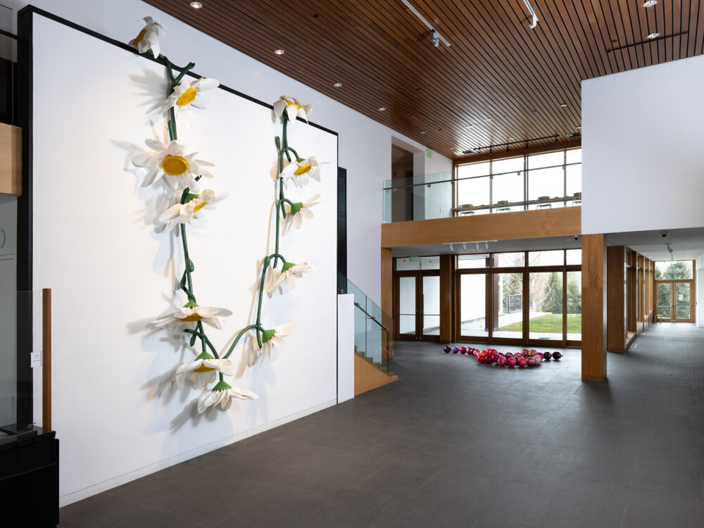 Kathleen Ryan: Head and Heart is the fourth installment of Aldrich Projects, a single artist series that features a singular work or a focused body of work by an artist every four months on the Museum’s campus. This project brings together two monumental works, Daisy Chain, 2021 and Pearls, 2017, conceived over a five-year span and sited in the Museum’s Leir Atrium.