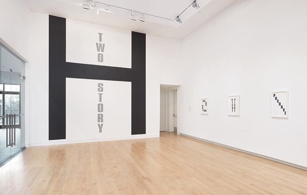 H Is for House is Kay Rosen’s first solo museum exhibition in the northeast in almost twenty years. This exhibition premieres a series of new works, all painted in black and white, which the artist has completed since 2015. Rosen’s text-based works use formalism, linguistics, and humor to reveal content that is hidden within both the structural nature of written language and the ways in which meaning can be generated through the manipulation of text. The exhibition will include fourteen works on paper, as well as two monumental wall paintings, the largest incorporating two walls and covering over 700 square feet. Rosen approaches written language as structure, with words and letterforms functioning as building blocks, and where, through unusual typographic arrangements, words and phrases can embody the thing they are describing. Rosen has created these new wall paintings to play off the interior space of the Museum, using the existing architecture to amplify each work’s content. Similarly, the vertical “architecture” of the paper works sets up a space for the text to play off, guiding meaning, letter orientation and size, and number of lines. Turning architect Louis Sullivan’s dictum that “form follows function” on its head, Rosen’s works take the forms inherent in text to create new functions for the written word.