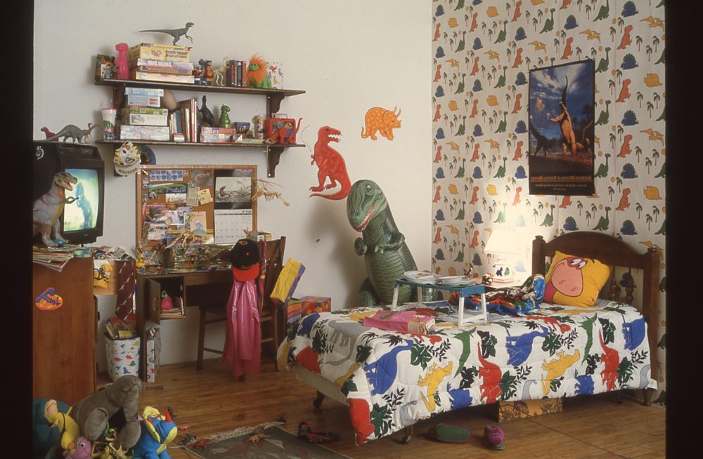 First assembled in 1994 and updated for this exhibition, When Dinosaurs Ruled the Earth (Toys R U.S. ) conceives of a child's bedroom decorated entirely with dinosaurs, from wallpaper and pillowcases to countless dinosaur toys, plastic figures, and stuffed animals. This installation slyly comments on the presentation and marketing of nature, particularly to children.