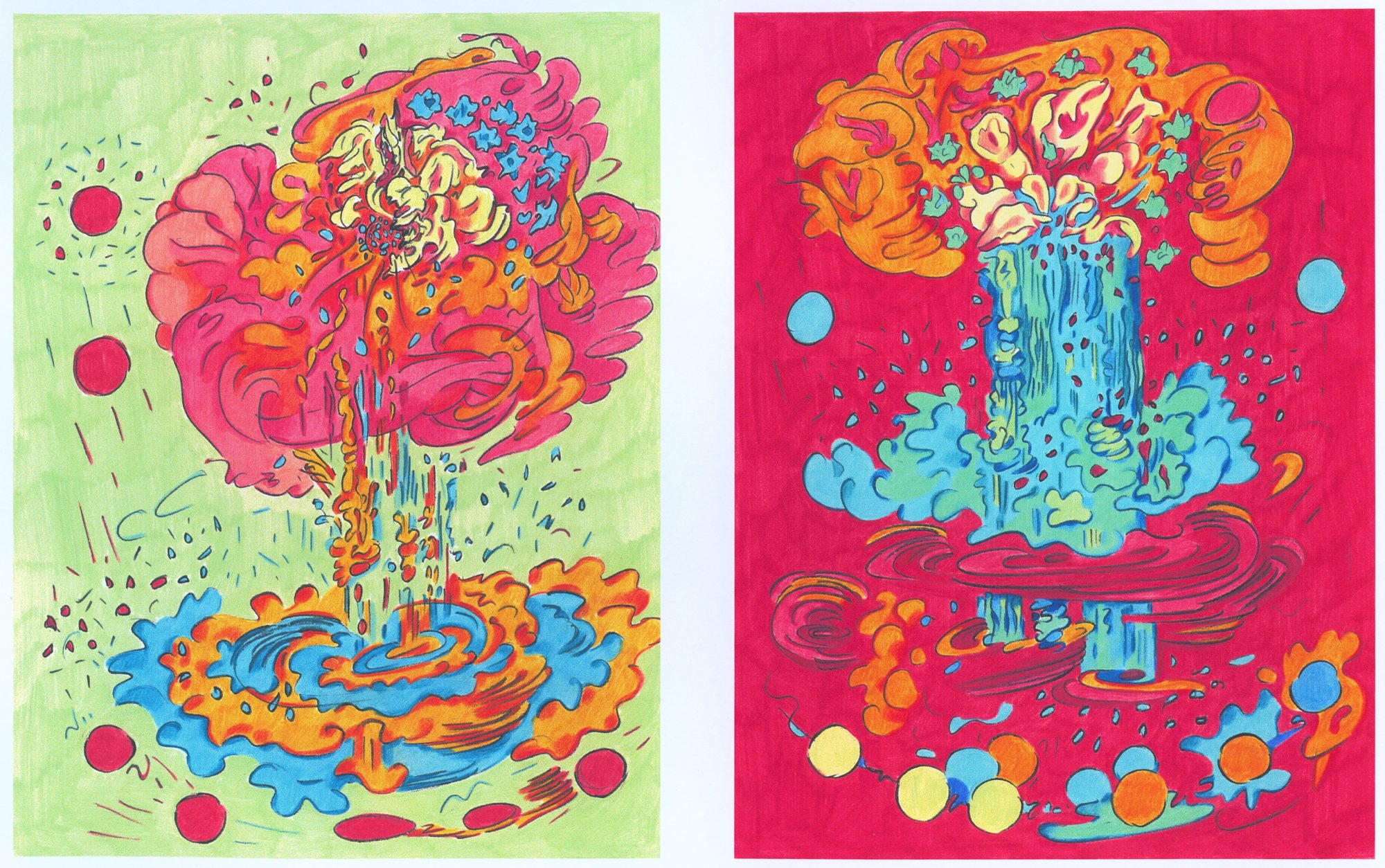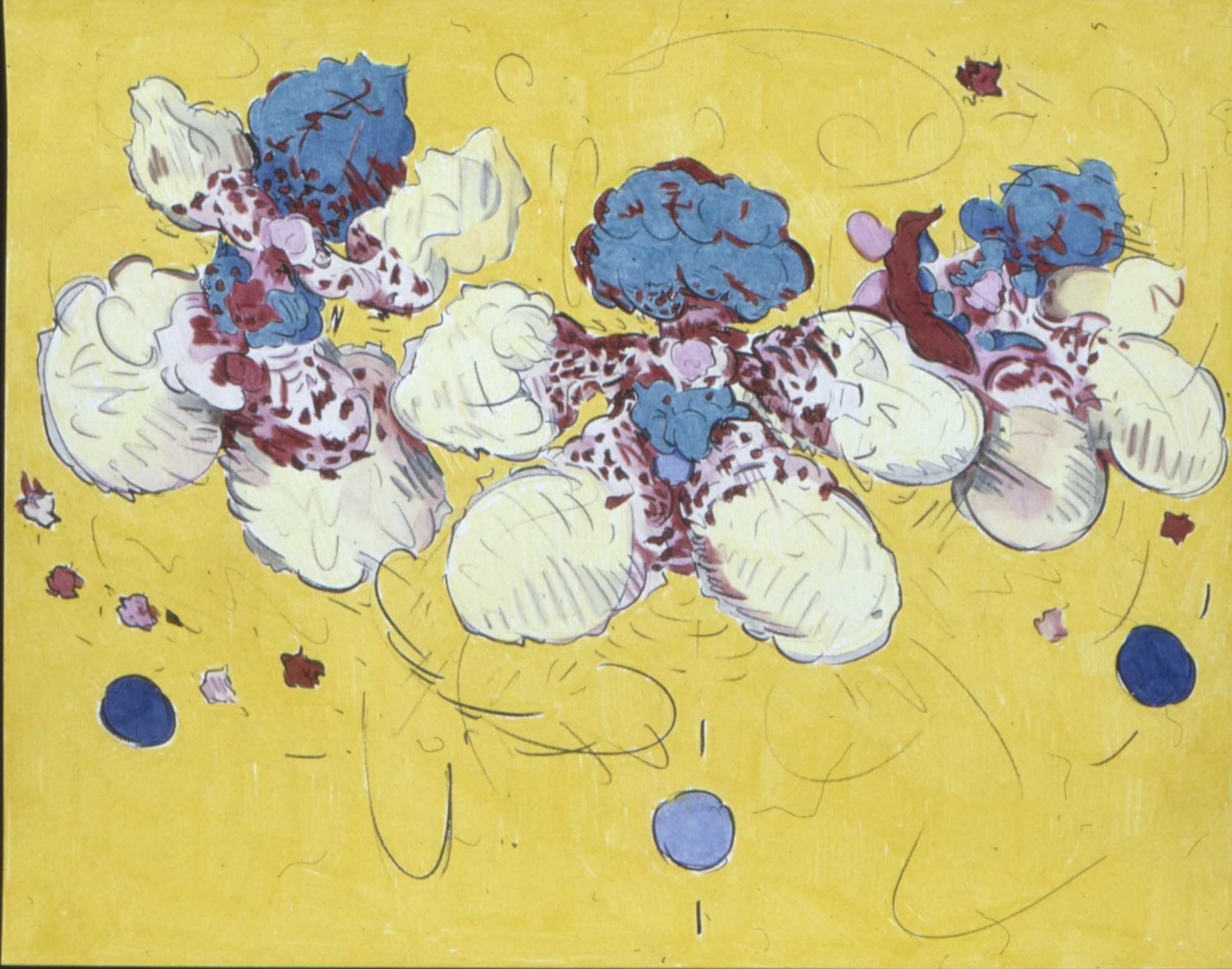 What is a self-aware abstraction? In conversation Marks asks one to imagine the possibility of one of Jackson Pollock's drips becoming conscious of its surroundings, and rising up from all the other drips (there is a sense of humor at play here) to become a sentient, sensuous entity, an aesthetically promiscuous character in a two dimensional drama. Drawing on sources as complementary as Michelangelo's Sistine Chapel ceiling and Marvel Comics, Marks has created a whirling frieze of Volitia's adventures which swirls across 17 outsize pieces of watercolor paper. But no page can contain Volitia, who leaps off the paper directly onto the walls of Leir Gallery — the walls surmounting the gallery's stage, of course.