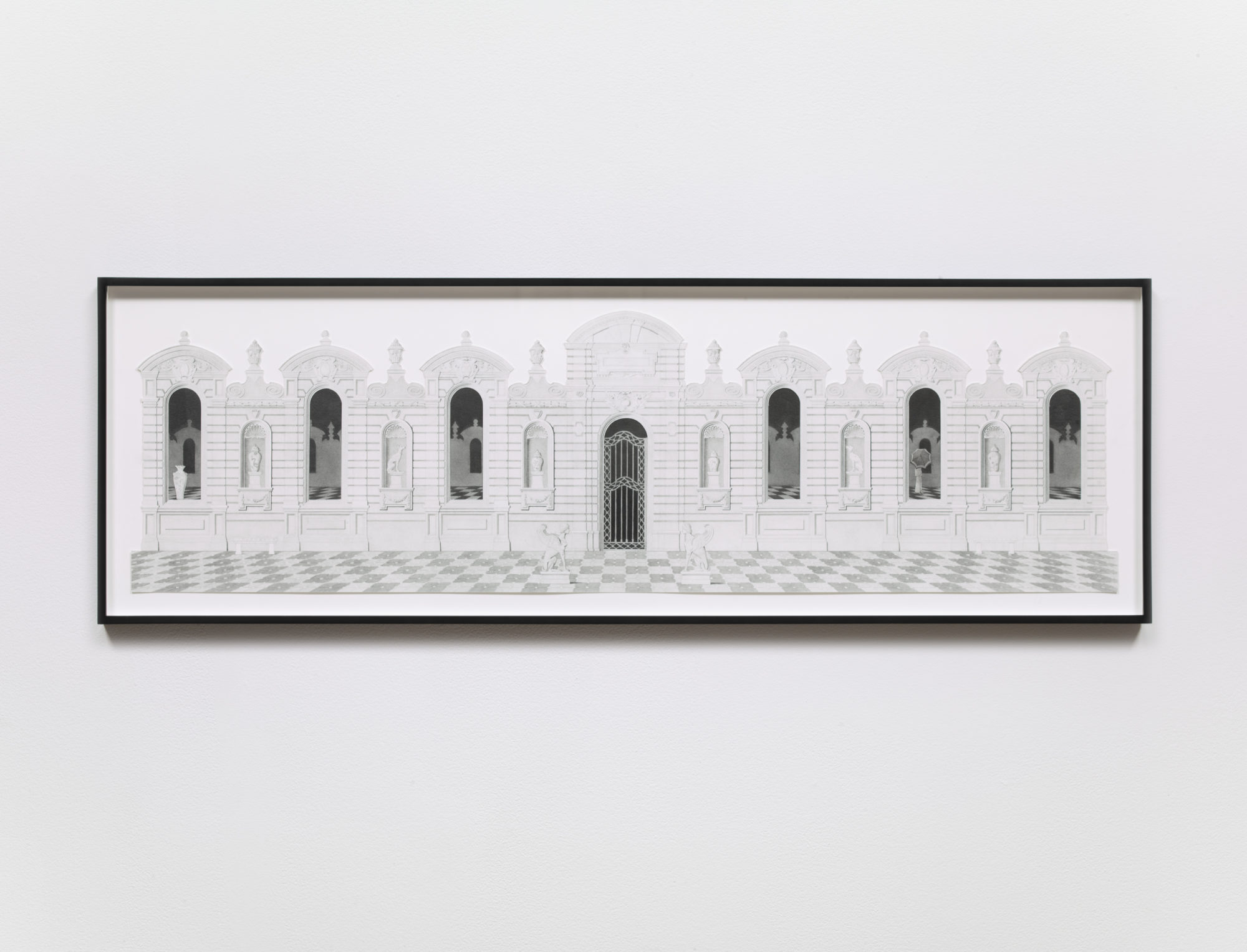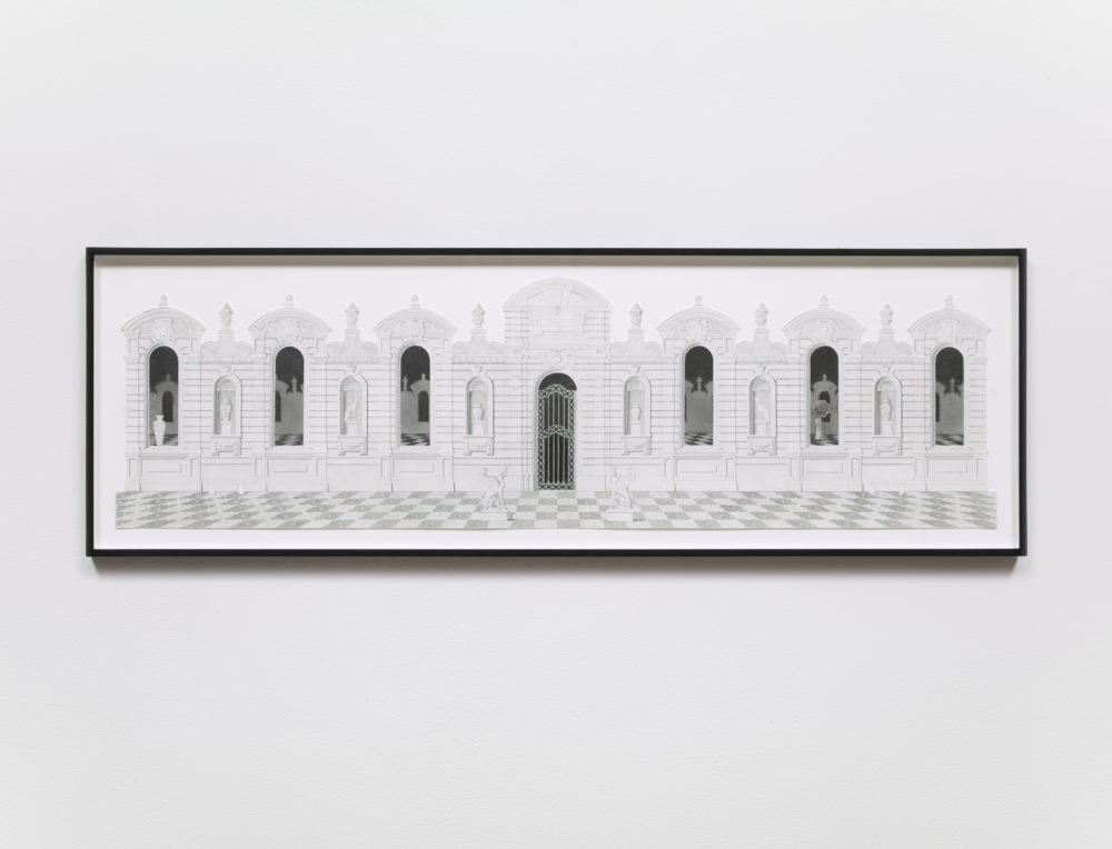 At first sight (the exhibition’s title translated from Latin), Chow’s impeccable handiwork elicits schematic designs for opulent buildings and interiors. But under closer study, odd details materialize, proportions are intentionally off-kilter with rooms haunted by solitary female characters. Her women, secluded behind heavily festooned windows, materialize as spectral presences trapped inside a darker subtext. Probing motifs such as voyeurism, alienation, and isolation, Chow exploits enduring symbols of grandeur and desire to survey gender, power, and social order.