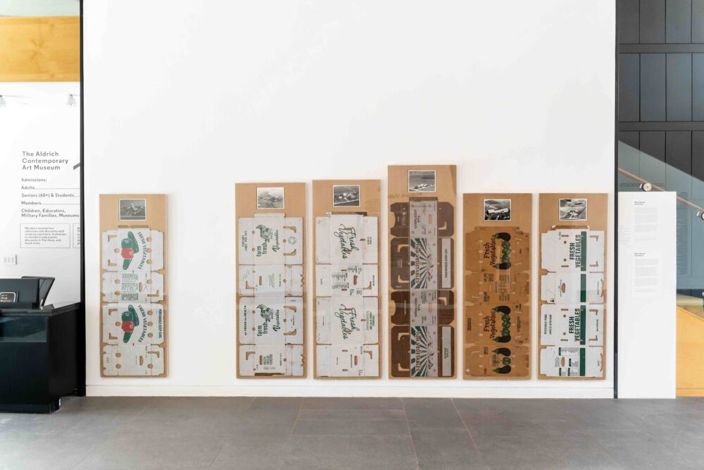 Each work in Overshoot consists of an aerial photograph set above an unfolded vegetable box, artifacts drawn from two distinct collections placed in opposition. The aerial images are from a photographic archive created by State Aerial Farm Statistics, a business that shot 16 million aerial photos of farms houses in 44 states over 60 years. While these photographs initially formed the basis for auditing and consolidating farm holdings, they are now administered by Vintage Aerial for the purpose of "preserving and presenting aerial photos of rural America in a way that evokes memories and encourages the sharing of our common history." The vegetable boxes are those that specifically have no company markings. Together with his collection of watering cans, these artifacts exhibit how industry uses idyllic language and images to harken back to the family farm as an example of quality and health. Now unfolded, the boxes are also metaphorically linked to the process of land surveying through vector space thinking: the methodical unfolding of the spherical globe into the flat diagrams that govern our relationship to our environment and each other.