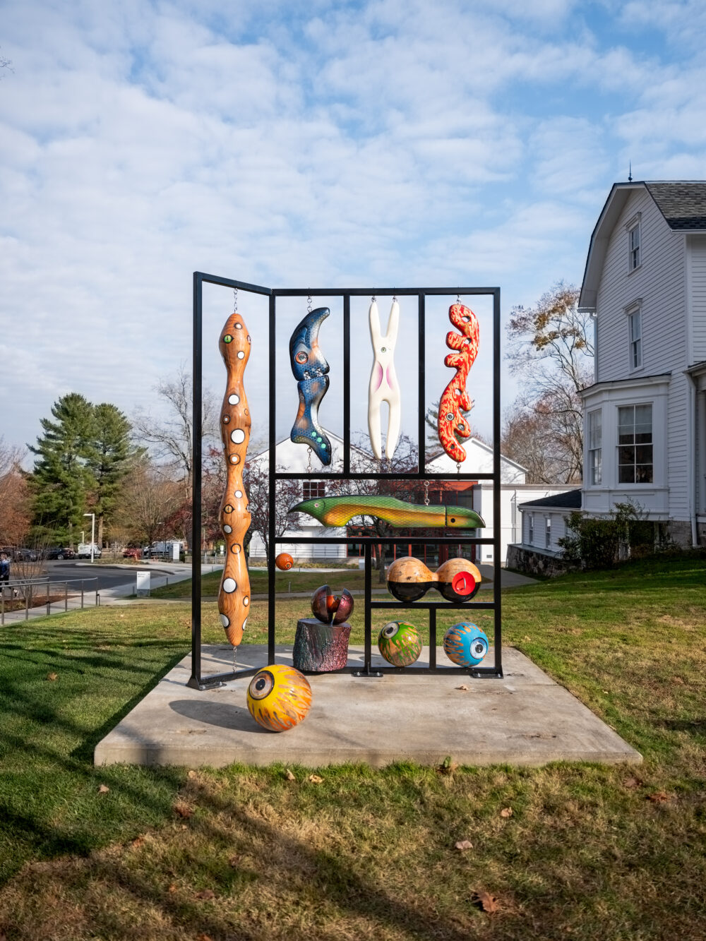 For her latest public art project, Fukuyama debuts a stylized fishing tackle box, a steel-framed structure that contains a menagerie of hand-carved, brightly painted objects that resemble fishing lures. The striking assortment of angler’s "bait" are meticulously crafted from a felled oak tree that once stood outside the artist's Brooklyn residence. Outlined but not enclosed, the sculpture’s open framework allows viewers to see beyond the wooden elements, placing humans in the position typically occupied by fish. This dual perspective not only plays with the rules of attraction but also fosters a dialogue between nature and its imitators.