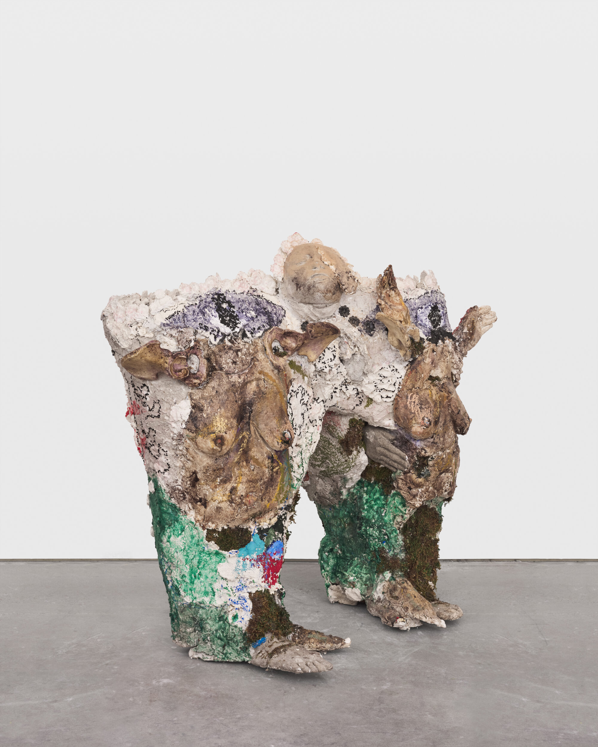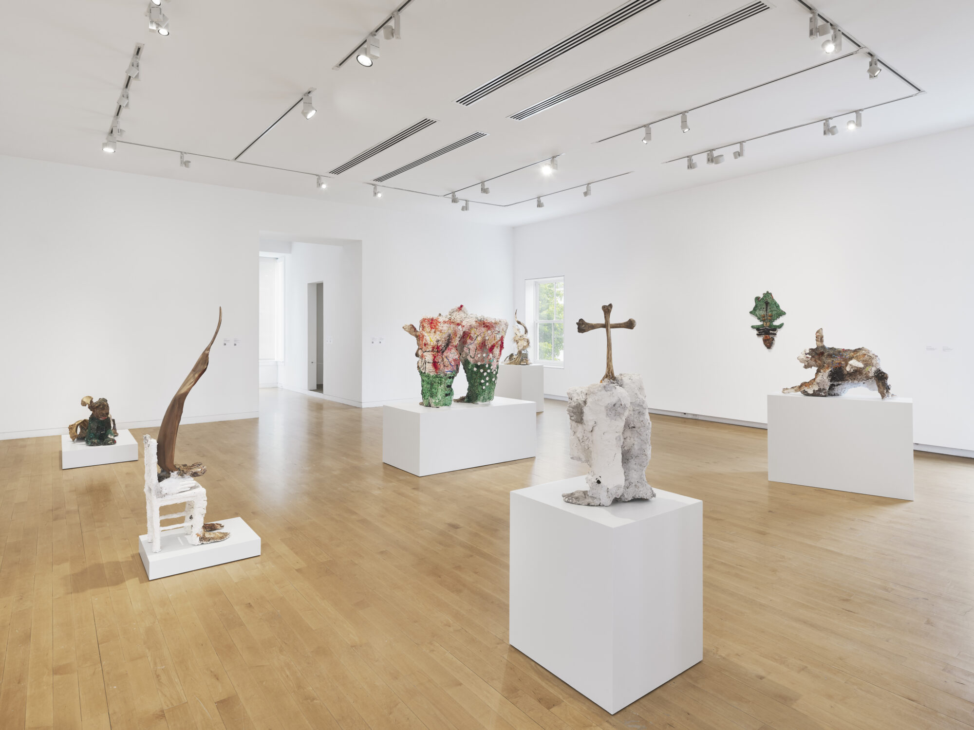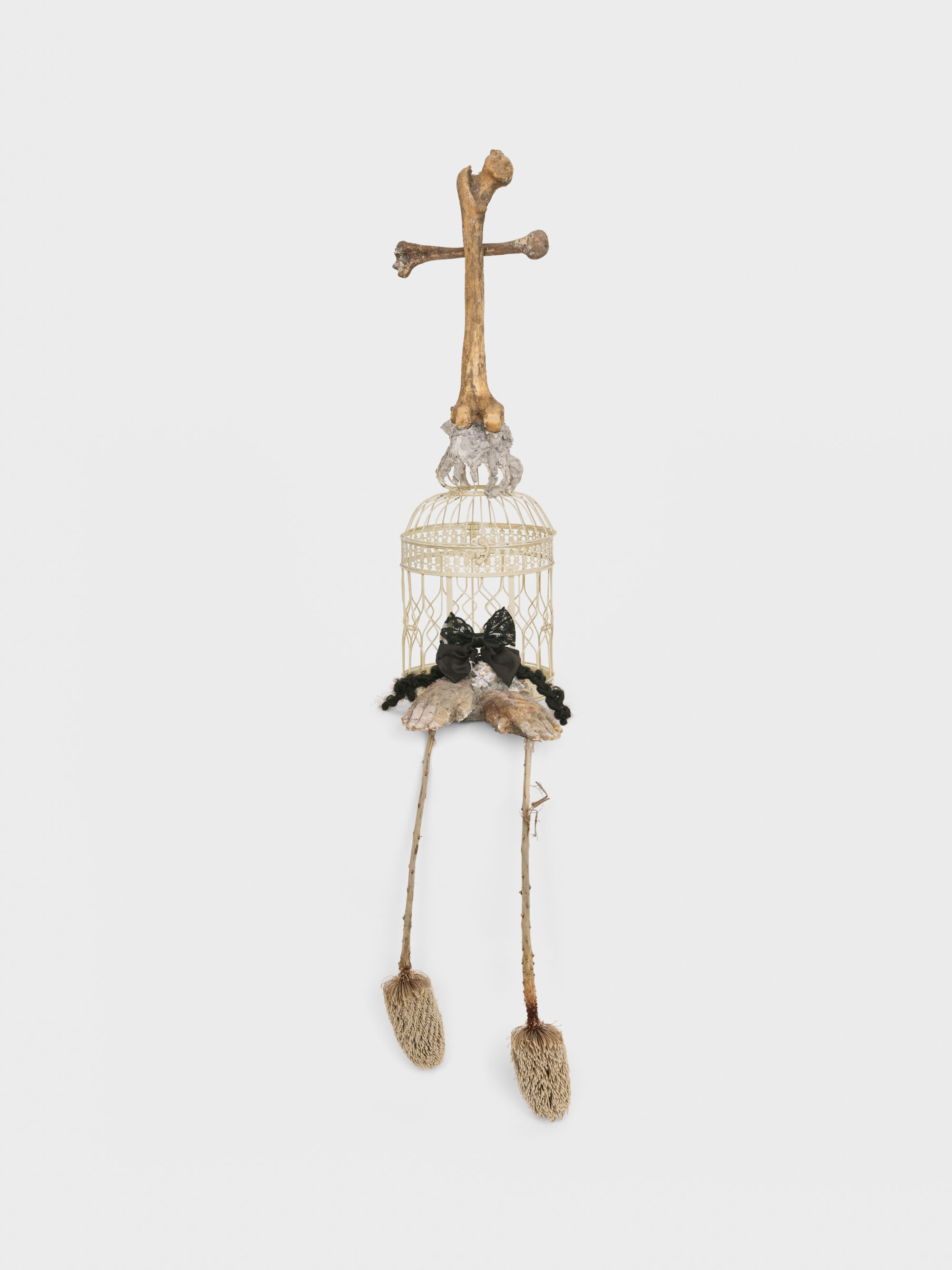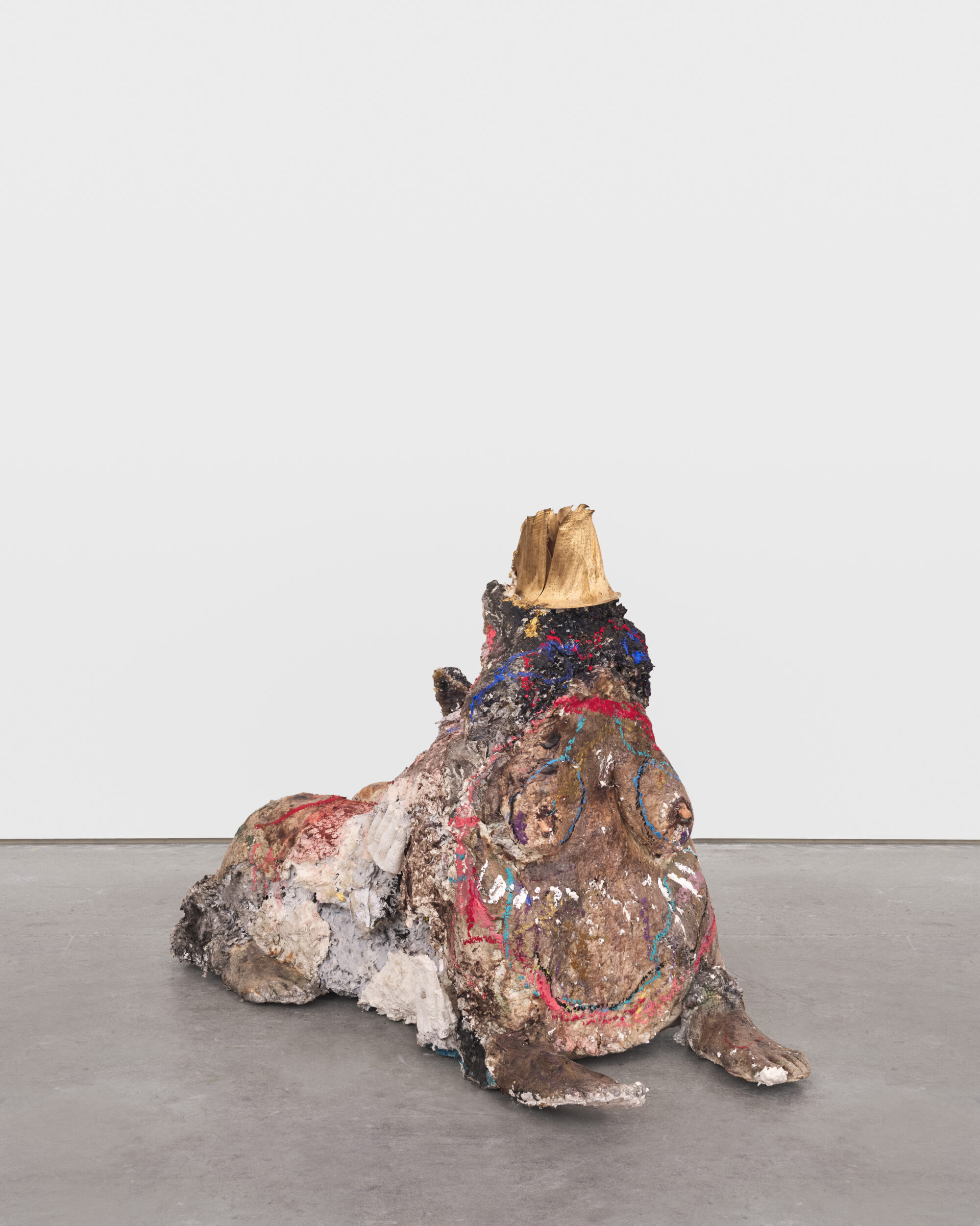 Nickola Pottinger’s practice spans drawing, collage, and sculpture. Her objects often appear in the round, on the wall, or sometimes within tableaux. She refers to her sculptural works as “duppies” (Jamaican patois for ghosts) in reverence to her Jamaican ancestry and the West Indian community in Crown Heights, Brooklyn where she was raised and still resides today. Composed out of recovered heirlooms, excavated and recycled materials, Pottinger creates pigmented paper pulp from family documents, past artworks, and rubble using a handheld kitchen mixer. Akin to clay or concrete and imbued with memories of her family lineage as well as folklore heard as a child, she embellishes her mystical creations, which sometimes manifest as protectors, couriers or even spirits of the deceased, with oil pastel and watercolor, casts of her hands and face, teeth, gilded Yagua leaf, lava rocks, Bantu hair knots and more. Her titles often reference their origins, places, memories, and adages specific to Jamaica. Sliding between figure and object, with references to her body, as maker and matter, her “duppies” resemble fantastical presences, spiritual talisman, and anthropomorphized furniture, with narratives fueled by dreams, actuality, and something in-between.