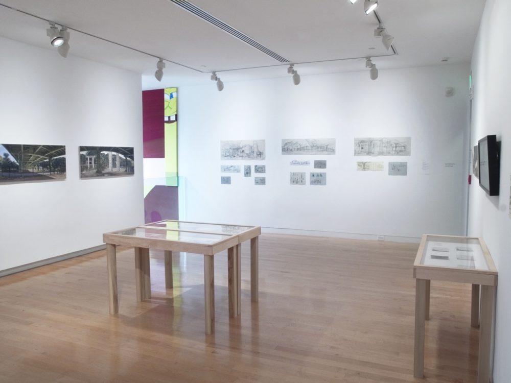 The finished paintings were primarily completed between May 2008 and August 2009. What appears to be a moment in time has been constructed by the artist—even the joggers and cyclists are carefully rendered from observation, as you can see in the central vitrine which houses a small selection of study drawings.