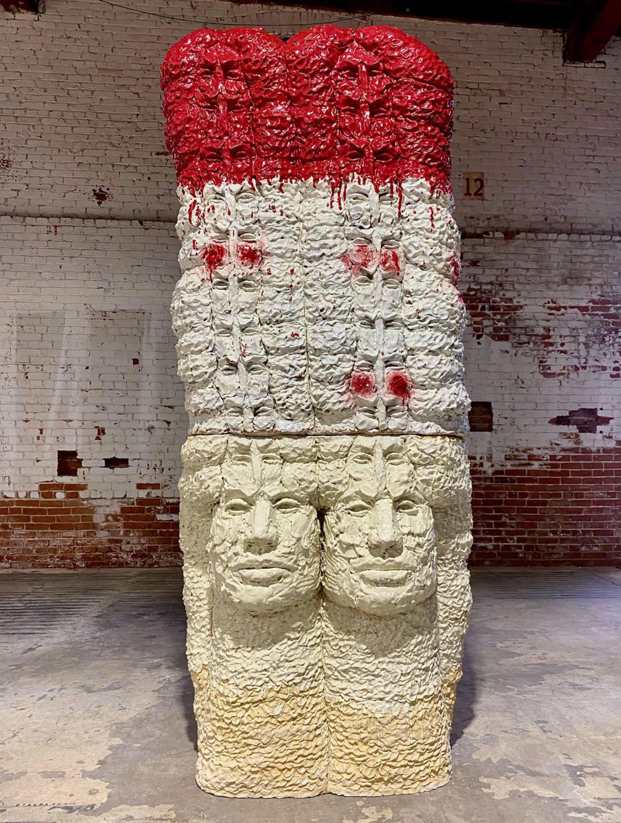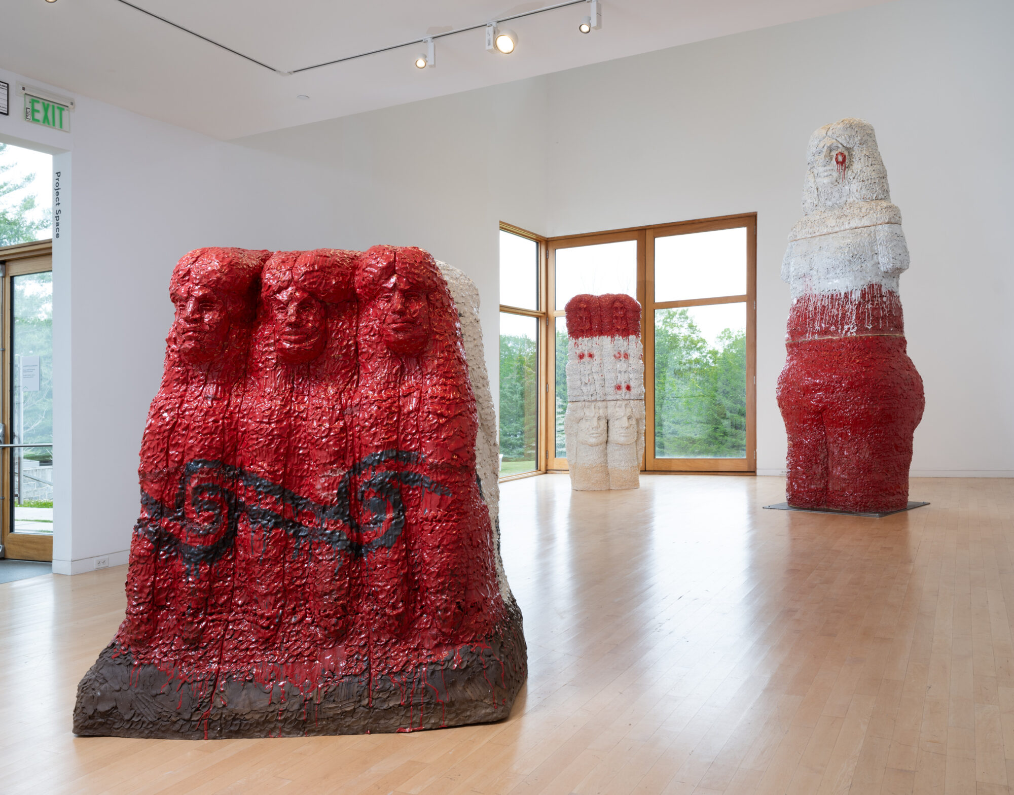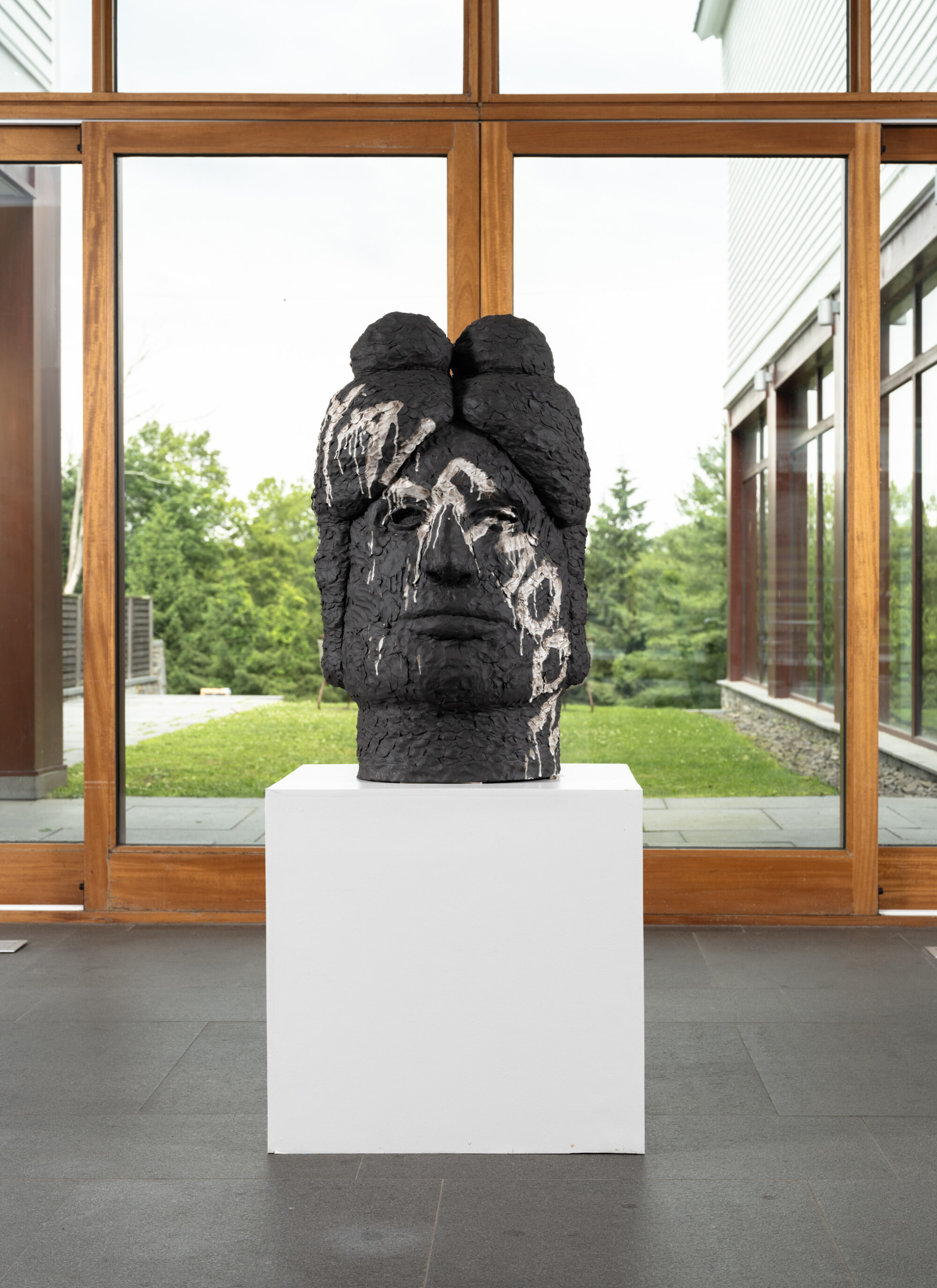 Raven Halfmoon’s practice spans torso-scaled and colossal-sized stoneware sculptures, with some soaring up to twelve feet and weighing over eight hundred pounds. With inspirations that orbit centuries from ancient Indigenous pottery to Moai statues to Land Art, Halfmoon interrogates the intersection of tradition, history, gender, and personal experience. Born and raised in Norman, Oklahoma, she learned about ceramics as a teenager from a Caddo elder. Working mainly in portraiture, Halfmoon hand builds each work using a coil method. Her surfaces are expressive and show deep finger impressions and dramatic dripping glazes—a physicality that presences her as both maker and matter. She fuses Caddo pottery traditions (a history of making mostly done by women) with populist gestures—often tagging her work (a reference to Caddo tattooing). Her palette is specific and matches both the clay bodies she selects and the glazes she fires with—reds (after the Oklahoma soil and the blood of murdered Indigenous women), blacks (referencing the natural clay native to the Red River), and creams. Sometimes she stacks and repeats imagery, creating totemic forms that represent herself and her maternal ancestry while also reinforcing the multiplicities that exist inside all of us. Her works reference stories of the Caddo Nation, specifically her feminist lineage and the power of its complexities. This exhibition will include a combination of new and borrowed works that vary in size and content from over the last five years. Halfmoon will also be creating some of her largest works to date commissioned by The Aldrich and Bemis Center. The artist’s first museum catalogue will accompany the exhibition.