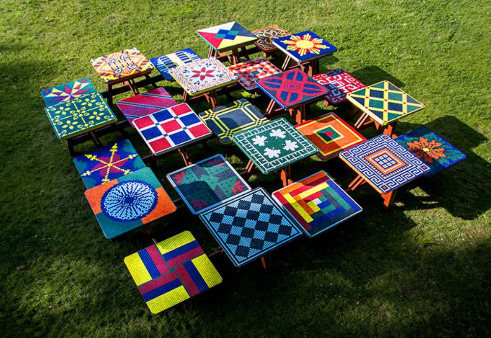 Common Ground is an interactive sculpture created by New York City-based artist and Aldrich alumna Risa Puno that celebrates harmony and inclusion through diversity. Puno’s work is a grid of connected tables and benches that are each tiled with a different mosaic design. Originally commissioned by the NYC Parks and Recreation Department as part of the Art in the Parks: UNIQLO Park Expressions Grant for Rufus King Park in Jamaica, Queens, the designs were inspired by the surrounding neighborhood’s unique mix of cultures and iconic architecture.