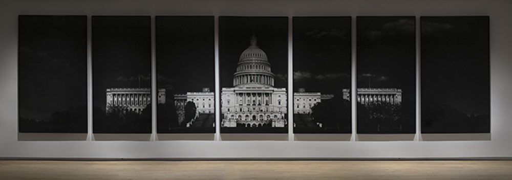 Proceeding upstairs to South Gallery, Capitol (2013), an immense seven-panel drawing of the US Capitol Building, hangs alone on the longest wall, its placement and dimension reminiscent of a cinema screen. The drawing’s compositional perspective and the minimal yet dramatic illumination of the artwork signal a durational effect, suggesting that like the building itself, Capitol is watched as well as seen. A drawing, a screen, a surface, it projects meaning but is also projected upon, a spectacular event preceded by the atomized storyboard of studies.