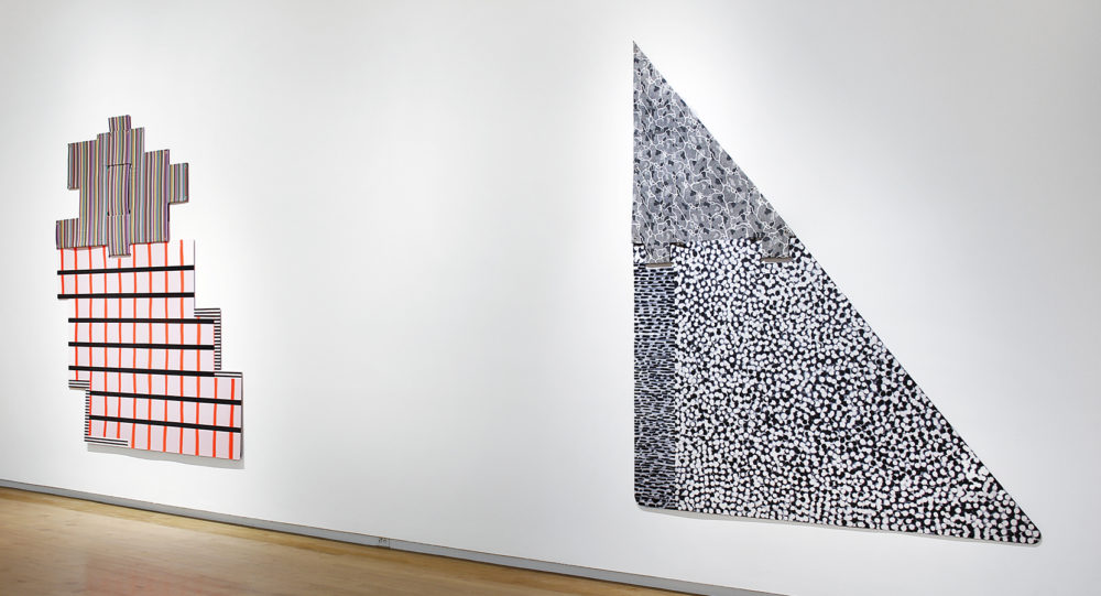 For more than two decades, she has worked within the language of abstract painting, exploring the physical and illusory boundary of wall and object, foreground and background, even inventing her own color wheel to challenge canonized color theory. Old, Odd, and Oval, will focus on her latest body of work, medium- to large-scale to site-engaged paintings that demonstrate her experimentations with new materials and fabrication methods as she combines hand-painted Plexiglas with colorful fabric patterns she designs digitally. Alongside these new works, The Aldrich will present an intimate salon-style hanging of Root’s painted paper collages, initiated in 1998, to demonstrate her advancing investigation of color, pattern, and composition as noted influencers of what was to come (evidenced by the new works in the adjacent galleries). These small, shaped, works on paper are geometric abstractions that feature quirky cartoonish elements to rupture color fields—madcap flourishes humanizing pure abstract reduction.