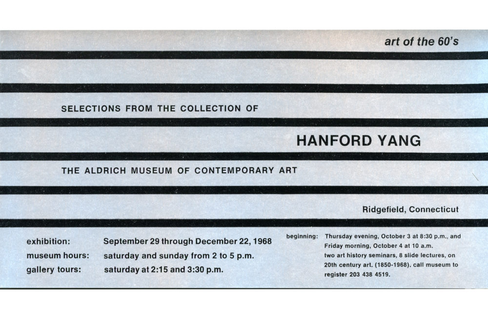 When the Aldrich Museum opened in October 1964, it was dedicated to the exhibition of the most recent developments on the contemporary art scene. The museum has always striven to maintain the highest standards of excellence in its exhibitions, and therefore is extremely please to present the exhibition – Selections from the Collection of Hanford Yang: Art of the 60s.