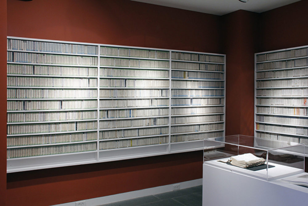 The Music Collection is just what the title of the exhibition implies, a view into LeWitt’s amassing of both scores by contemporary composers and an encyclopedic library of recorded music. The collection of recordings, personally transferred by the artist from vinyl and radio onto the medium of cassette tape, represents thirty years of effort (the most recent tape dates from 2002). The cassettes, which lined the walls of a small room in the artist’s Chester, Connecticut, home, have been installed at The Aldrich to mimic their original organization on white wooden shelves. The consecutive numbers on the spines of the cassettes and their notation in an accompanying logbook catalogue 3,970 individual tapes.