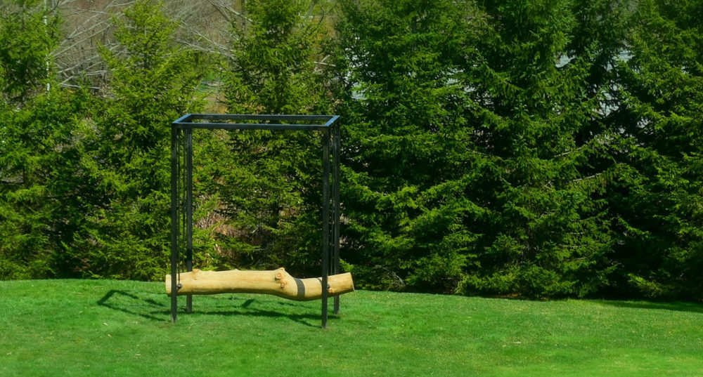 Overton’s approach to the exhibition process is a combination of research and on-site decision making. For The Aldrich, she has created thirteen site-reactive sculptures and a video, presented inside the galleries, in the Sculpture Garden, and on the roofline. Each informs the other as the works reverberate throughout the building and boomerang out onto the grounds, offering multiple lines of sight. Many of the sculptures are composed of elements harvested from a dead eastern white pine felled on the Museum’s grounds. Some works feature indigenous materials scavenged on the premises alongside items Overton collected at the studio or recycled from past installations. Overton transposes the energy encapsulated within these objects, draining them of their normative purpose, and imparting them and their circumstances with a new functionality.