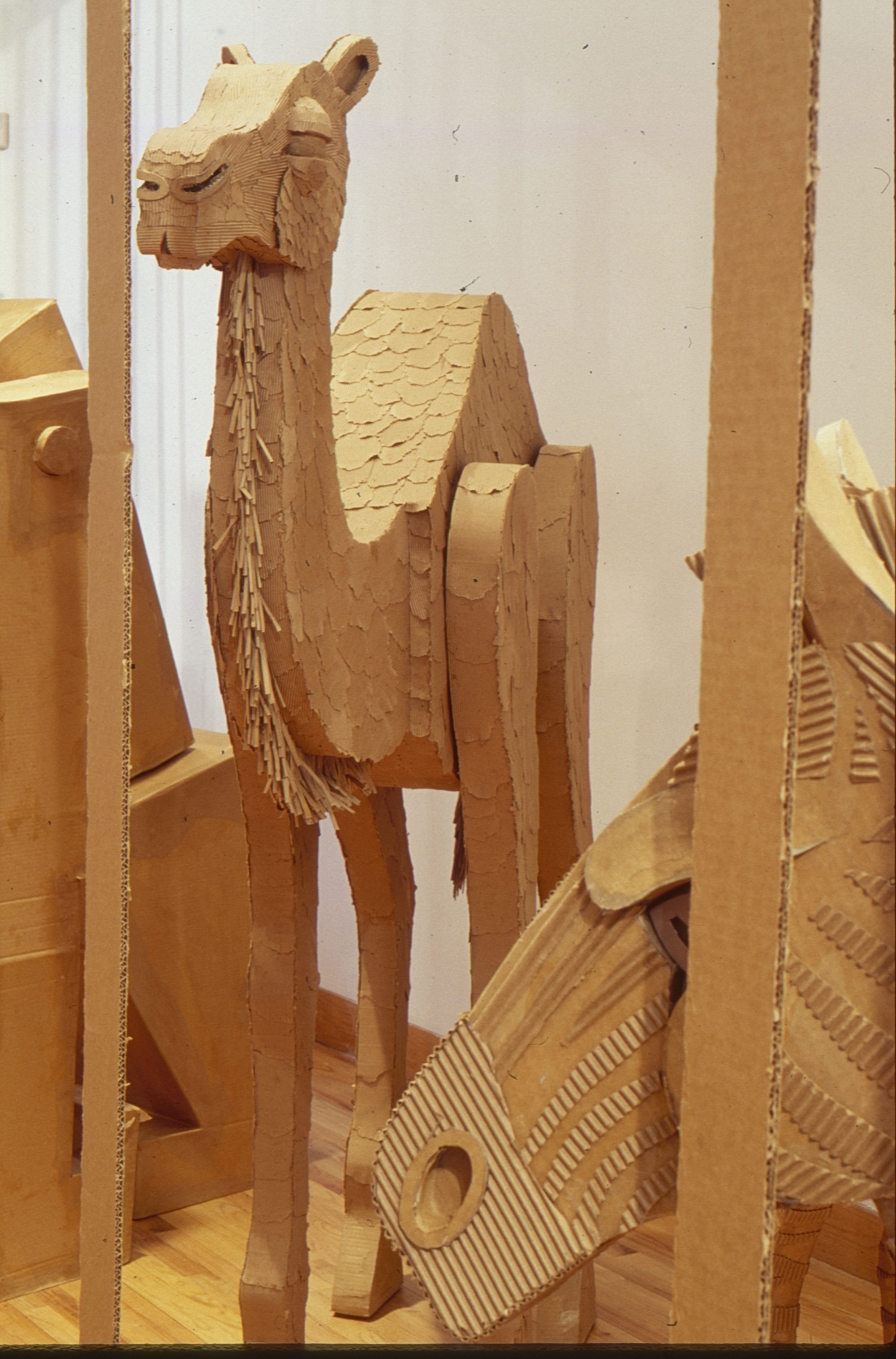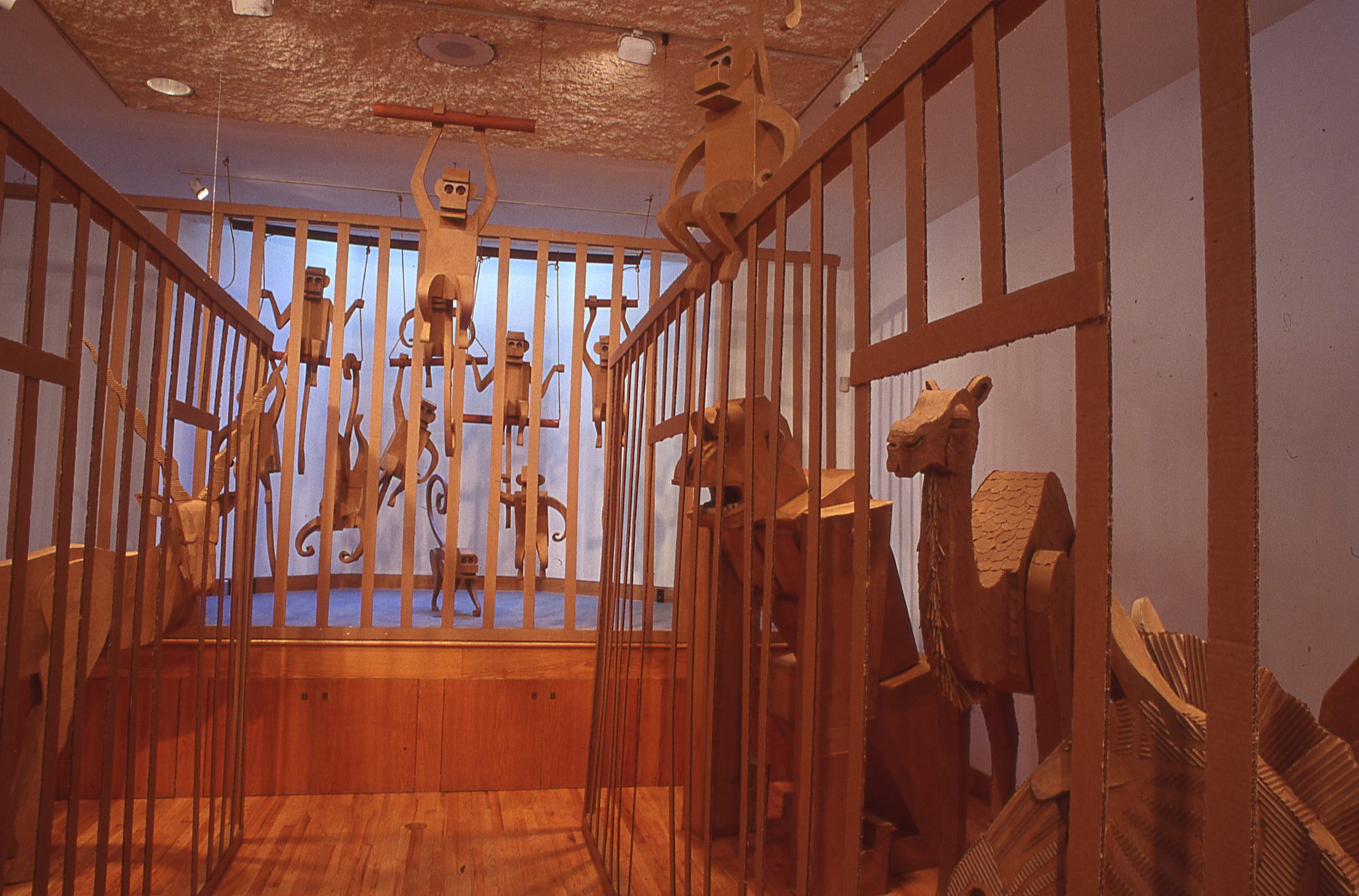 Redding artist James Grashow transformed the Museum's Leir Gallery into a zoo of wild jungle animals. Crafted from plain and corrugated cardboard and assembled with Elmer's Glue and paper packing tape, these larger-than-life size animals were arranged so that visitors could stroll throughout the gallery in the corridors between their cardboard cages. Grashow fabricated as many animals as possible to replicate the thrill and variety of an actual trip to the zoo.