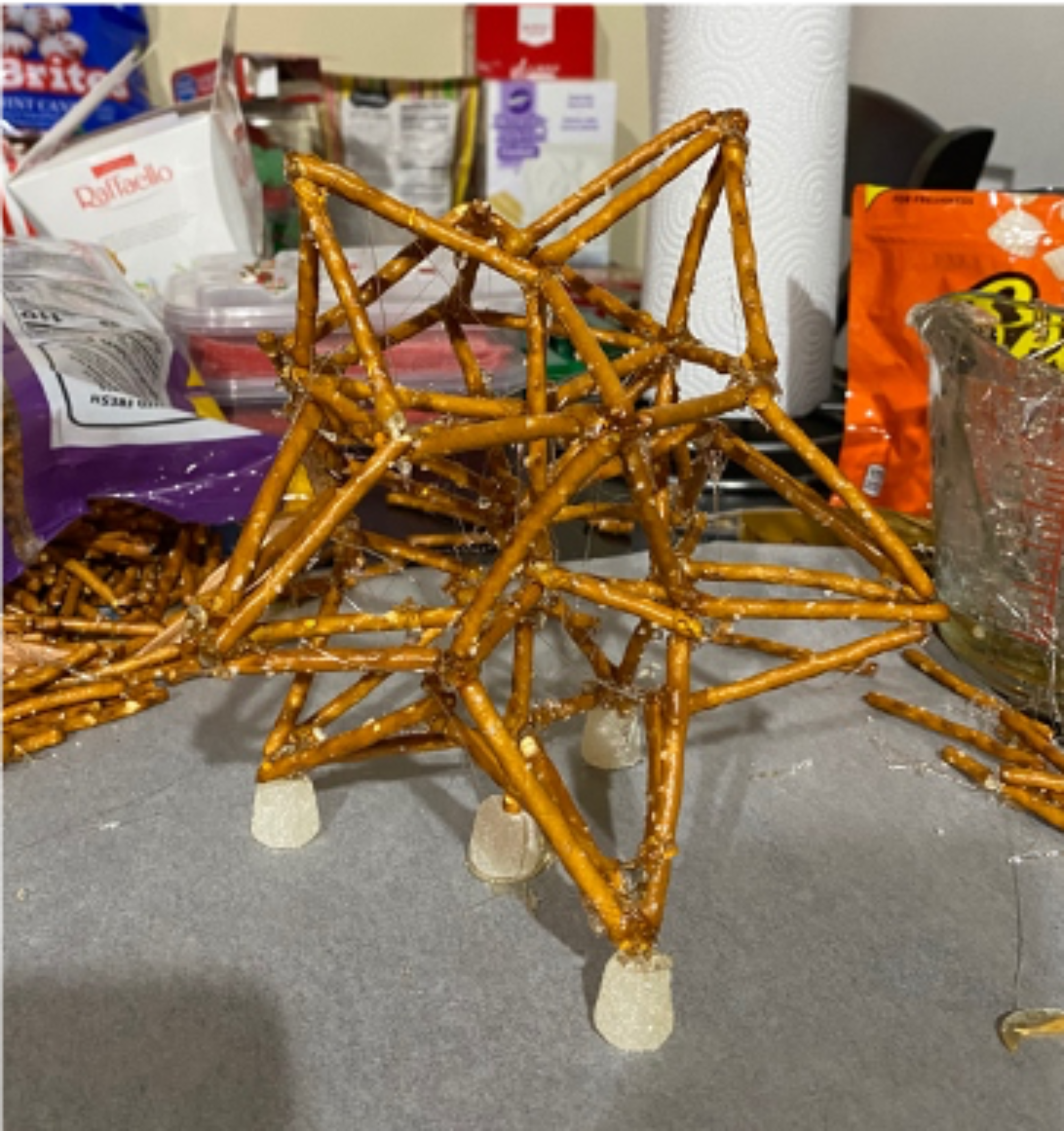 Since I didn’t have much room in the “Sculpture Garden,” I decided to only make one of the large stars. Because Jasper’s Split Star, 2017, had similar legs to Fat 12 Point Carbon Fiber Star, and because I had no clue how to make a latticed endpoint, I went with Frank’s Wooden Star, 2014. Our Director of Marketing and Communications, Emily Devoe, had the brilliant idea to use pretzel sticks. I honestly thought that this star was going to be easy (*laughs at my foolish, more naïve self*). Let’s just say that my first star combusted under pressure…or my hand. My second attempt proved more successful because I switched my “glue” from royal icing to chocolate to hot sugar. Hot sugar is an amazing fixative, but the thing about hot sugar is that, well, it’s hot. I had to be careful with this assembly process because hot sugar burns are no joke, especially because it’s basically glue that you can’t get off. I’m happy to report that no injuries were endured, and my method was a success!