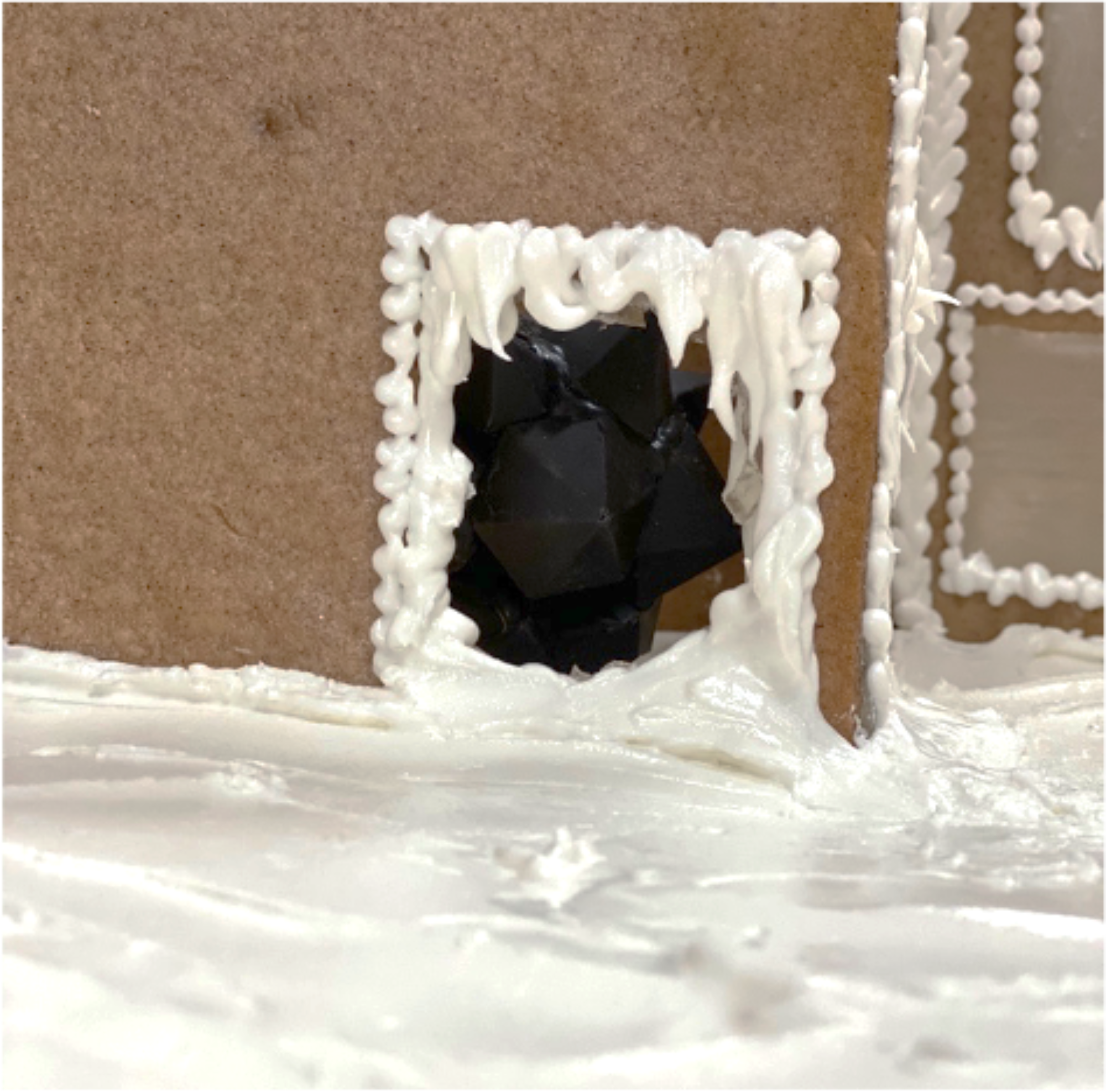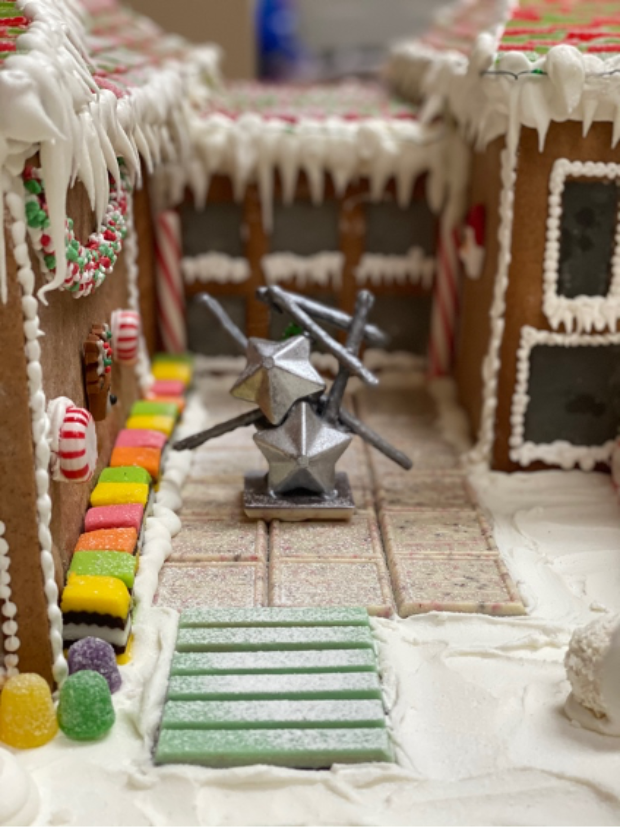 Lastly, I wanted to make Stainless split star with truss segments, 2016, which is installed in The Aldrich’s inner courtyard. This sugar sculpture was shockingly simple to make and may be my favorite addition to the gingerbread museum. I found a star mold that was a bit more stylized than others I’ve seen but would have still been too flat to have used for Fat 12 Point Carbon Fiber Star. However, it worked perfectly for this piece. I used the leftover black candy melts and filled four stars in the mold. After the chocolate hardened in the freezer, I joined the flat sides of each together, creating two stable star forms. I adhered one of the stars on top of the other using warm chocolate, and then affixed chocolate-coated pretzels onto the conjoined body. Once the piece rested for a bit and the chocolate firmed, I painted the entire thing with metallic silver edible dust and placed it in the courtyard.