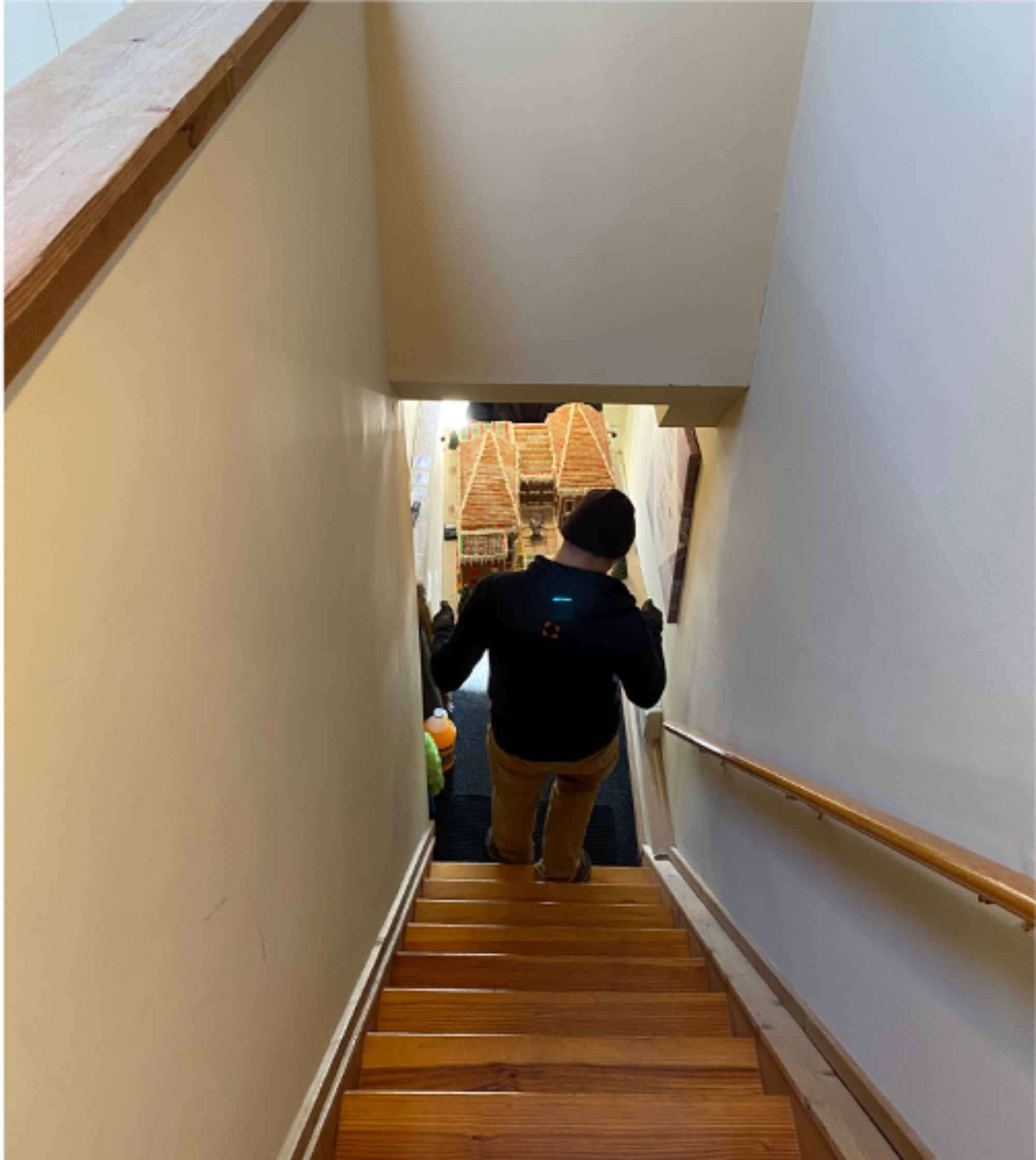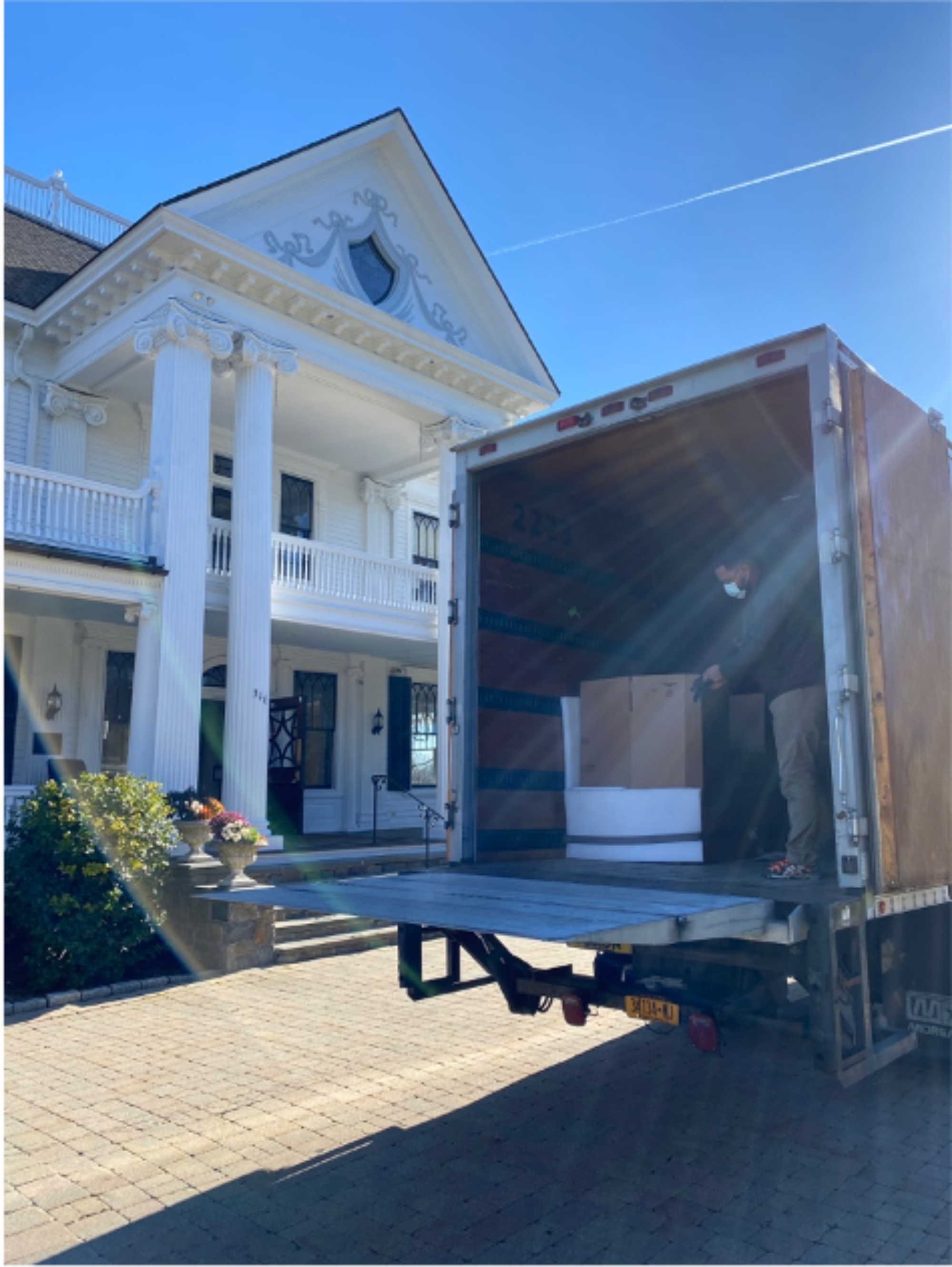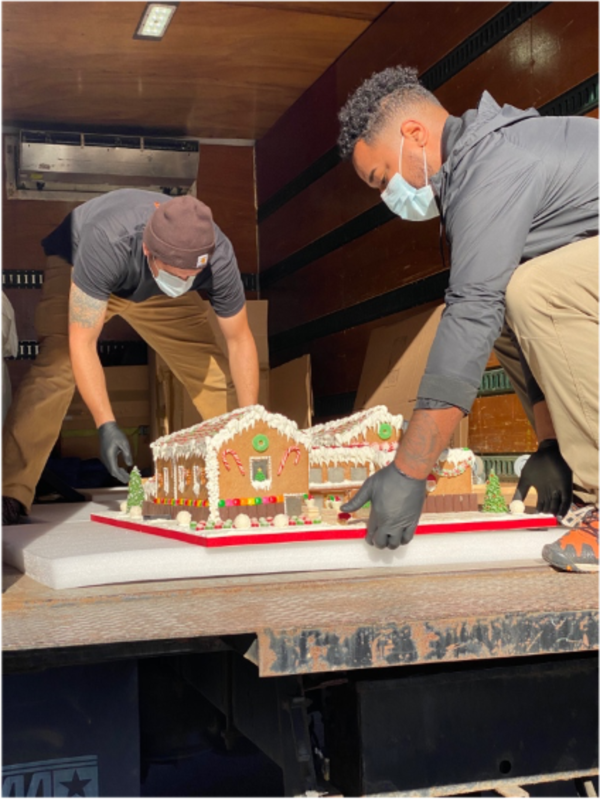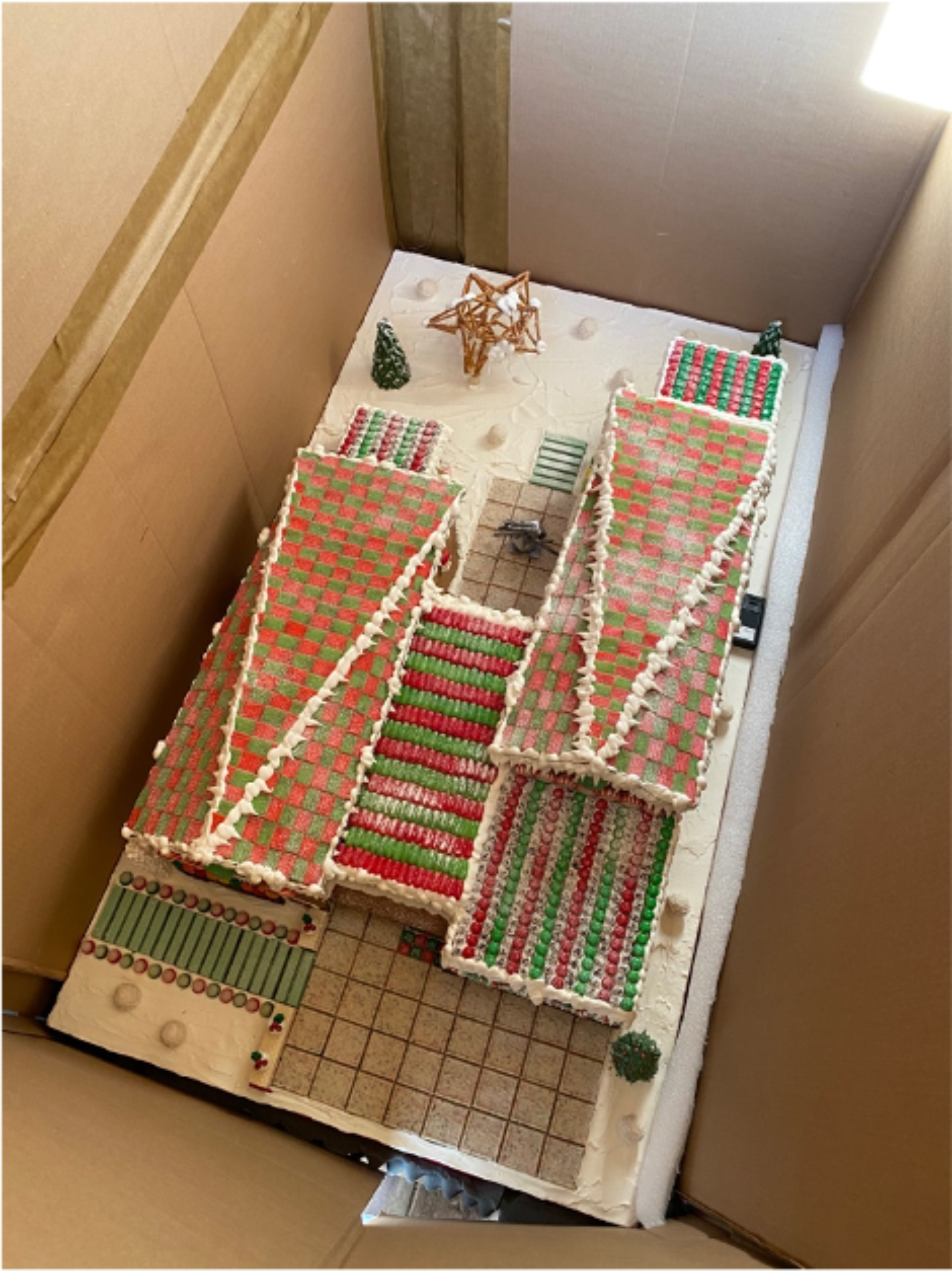 Now that the gingerbread Aldrich was finally complete, there was still one last challenge ahead of me: transportation. I am here to attest that after working with incredibly fragile desserts and tiered cakes for many years, orders are never truly finished until they arrive safely to their destinations, resulting in many anxiety-filled, sleepless nights. Lucky for me, our Registrar-extraordinaire, Mary Kenealy, had the idea to ask our trusted art transportation company, Crozier Fine Arts, if they’d be interested in transporting the gingerbread museum to the Lounsbury House. Crozier excitedly agreed and the crew came to my studio apartment to pick it up—a huge thank you to Crozier for alleviating my gingerbread stress! Their dedication to safely transporting the gingerbread house exceeded my expectations: they actually created a custom box with layers of foam that fit to the gingerbread museum’s dimensions perfectly. The guys agreed that this was not their typical cargo, and it was very funny to see the giant truck pull up to the Lounsbury House with this special delivery.
