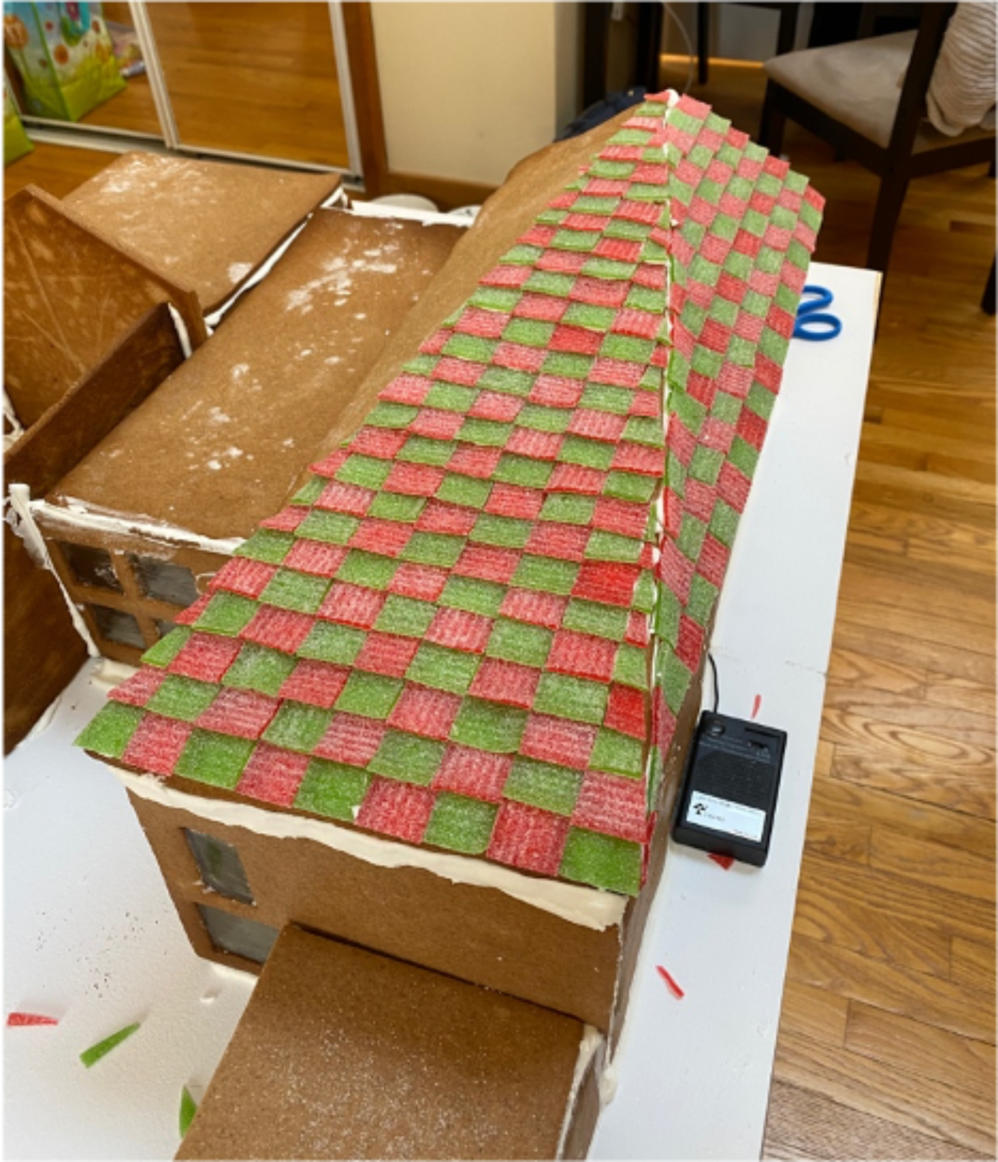Now that the structure itself was complete, I was able to move on to the really fun part: DECORATING! (Although, filling a shopping cart with $100 worth of candy may have been more fun than the actual decorating.) I started off with the two long roofs because I knew what I wanted to do with them: create red and green shingles using sour strips cut into squares.