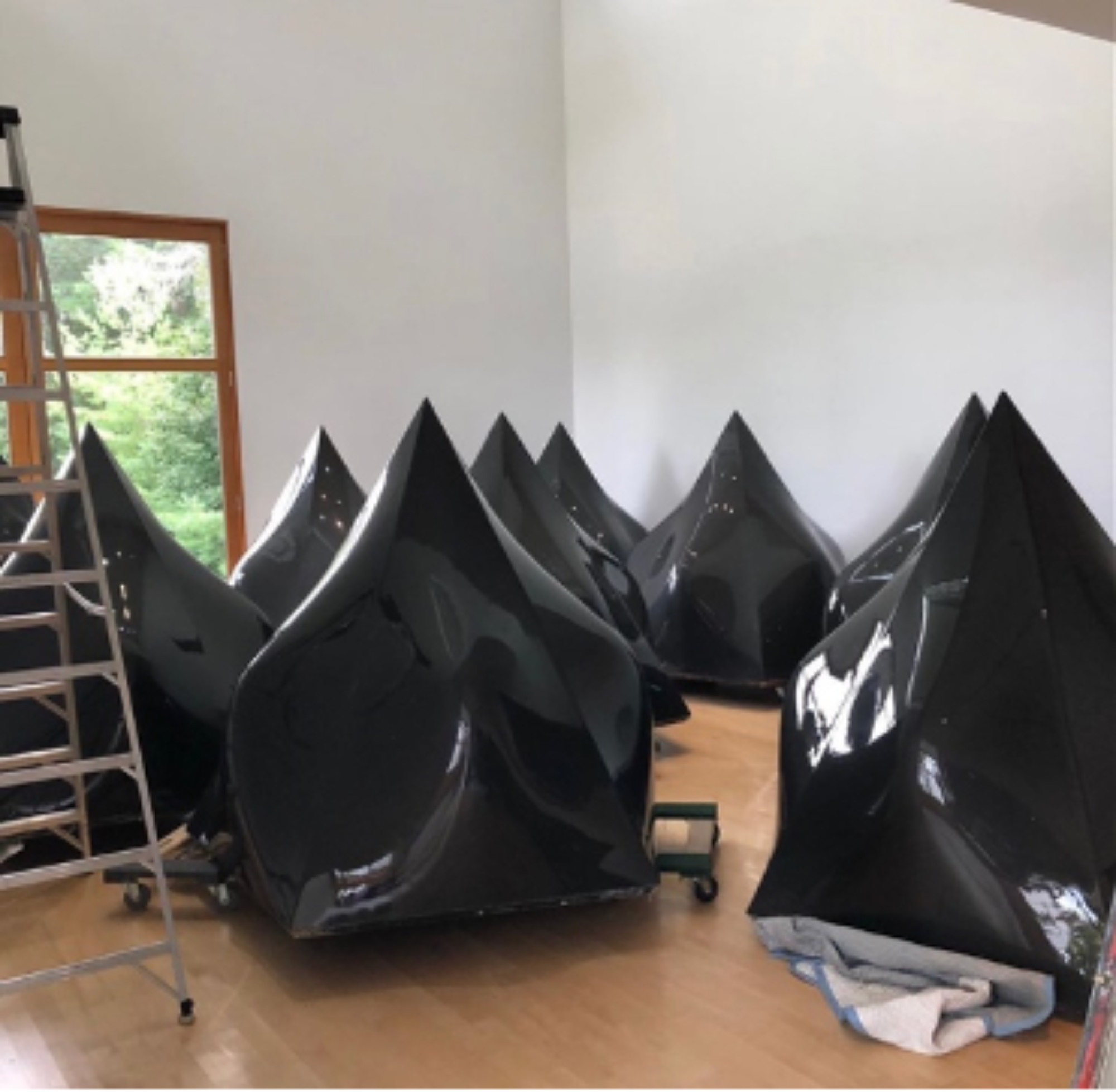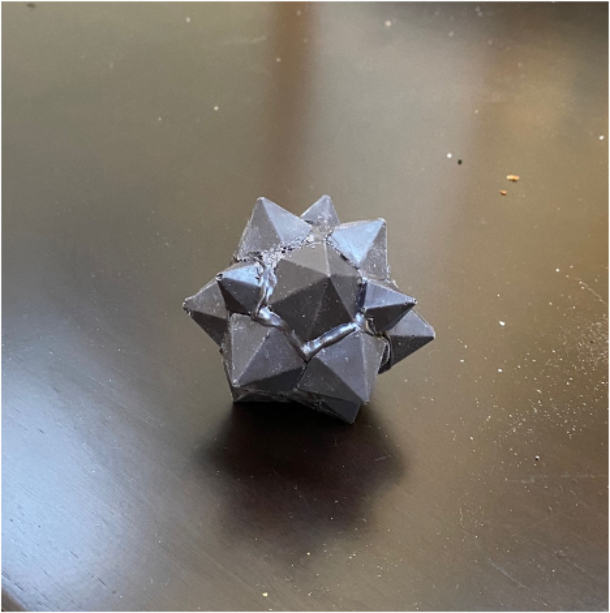 I thought it would be awesome to have a sugar version of Fat 12 Point Carbon Fiber Star, 2016, in the gingerbread Project Space (the Museum gallery located in the rear of the right annex) and be able to see it looming through the illuminated sugar glass. I tried looking online for a star-shaped chocolate mold, but I only found traditional five-pointed stars that didn’t have much depth, so then I thought about deconstructing the star in the same way that it was created (see assembly photo below)—if I could find a mold with a similar shape to just oneof its pointed arms, then maybe I could conjoin multiples together to create the form. The closest thing I could find to this shape was a diamond mold (very popular for bridal showers and wedding treats). I melted down a bag of black candy melts, poured the chocolate into the mold, popped it in the freezer for about ten minutes, and VOILA! To my surprise, my idea worked, and it was actually relatively simple to build. I put some warm chocolate in a piping bag and used it as glue to fuse the rays together.