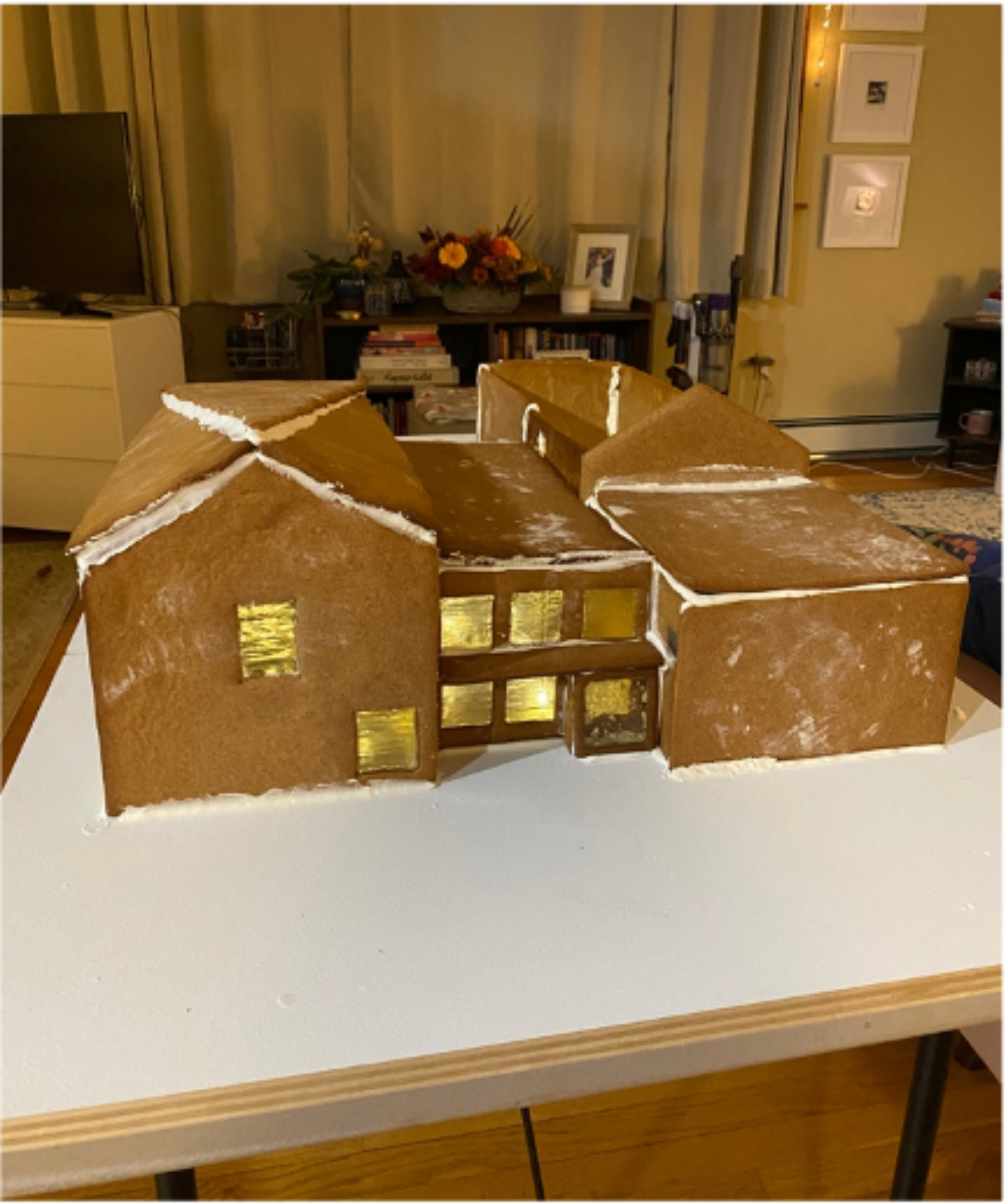 My name is Caitlin and I’m the Curatorial Assistant and Publications Manager here at The Aldrich. Before I started working at the Museum full-time, I worked at many bakeries in New York and Connecticut for several years as a sugar artist of sorts. This is how I made a living after undergrad and throughout grad school—and it’s still one of my favorite “mediums” to work with in my free time. Naturally, I jump with joy at any chance to combine my love of art with my love of baking, so when our Executive Director, Cybele Maylone, asked me if I would be interested in making The Aldrich out of gingerbread for a local event at the Lounsbury House, I almost fell off my chair in excitement. It’s worth noting that I also happen to be a holiday fanatic (to put this in perspective, my office desk is usually embellished with Christmas lights and a mini tree this time of year). Needless to say, I was thrilled to take on this project.