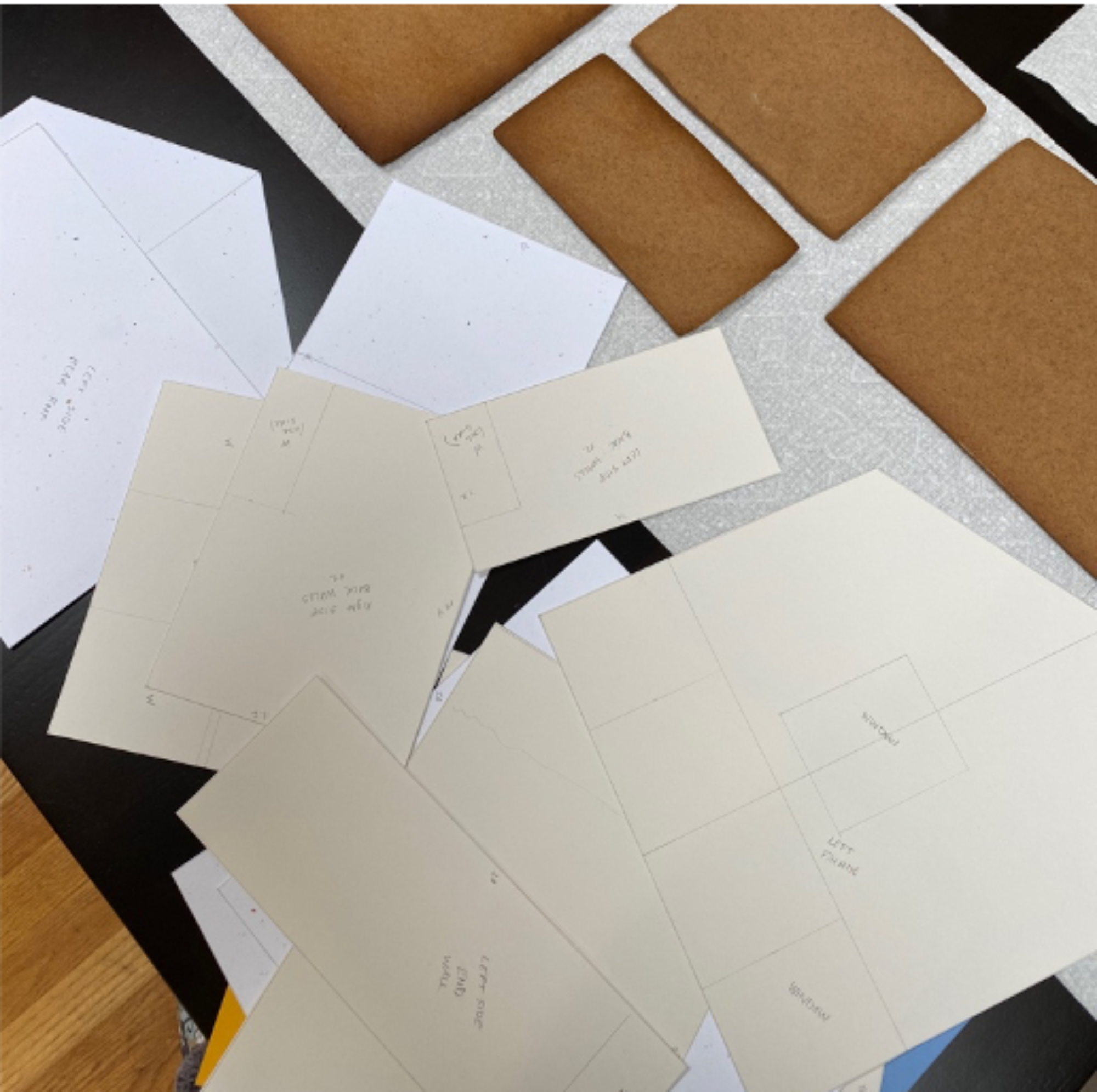 After making an absurd amount of dough and royal icing, I moved onto the planning stage. This stage is also known as the headache-from-too-much-math stage. Here I must give many thanks to our Head of Exhibitions and Facilities, Chris Manning, who provided me with the Museum blueprints and a custom plywood base (which he had to re-cut after I had the delayed idea—again, ambition fog—to measure my door frame). In order to simplify the blueprints, I made small, very rough sketches of every front-, rear-, side-, and top-facing shape, then converted the measurements to the appropriate scale and created a template guide.