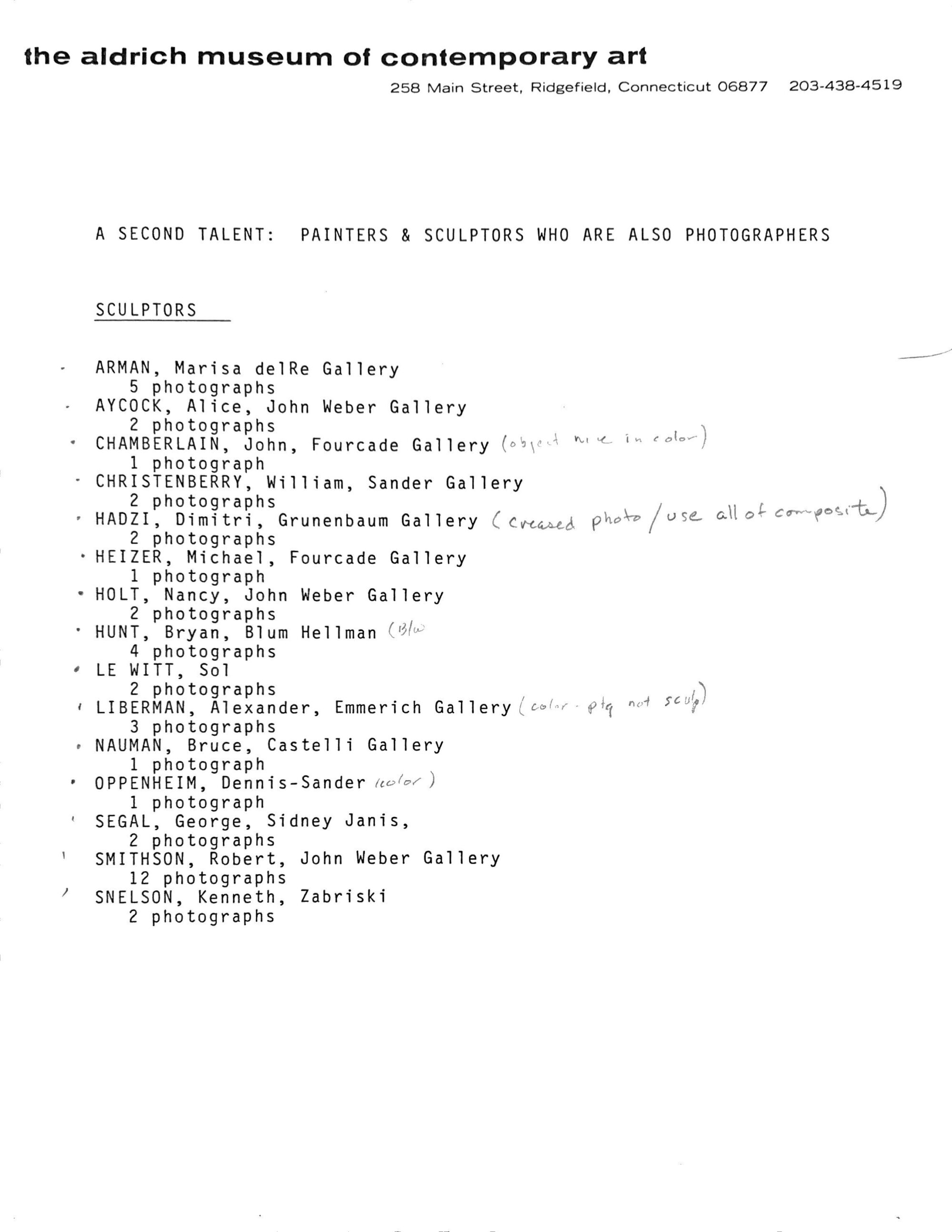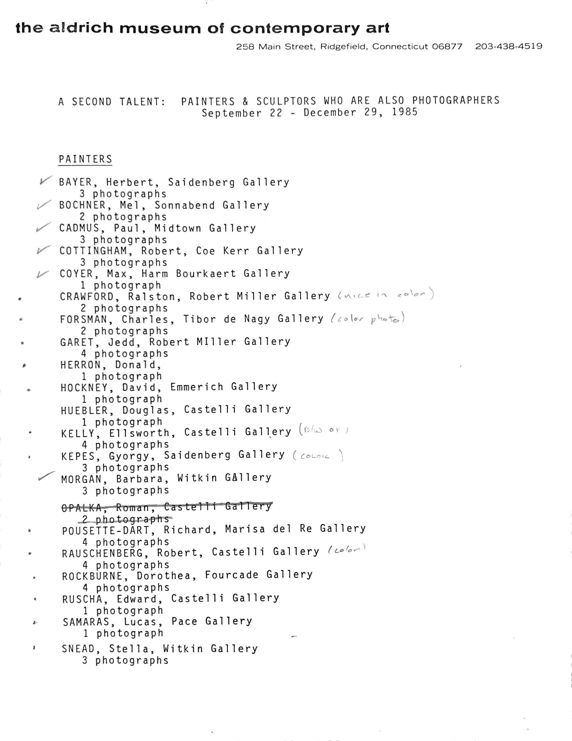 The Aldrich Contemporary Art Museum. “A Second Talent: Painters and Sculptors Who Are Also Photographers,” February 6, 1985. https://thealdrich.org/exhibitions/a-second-talent-painters-and-sculptors-who-are-also-photographers.