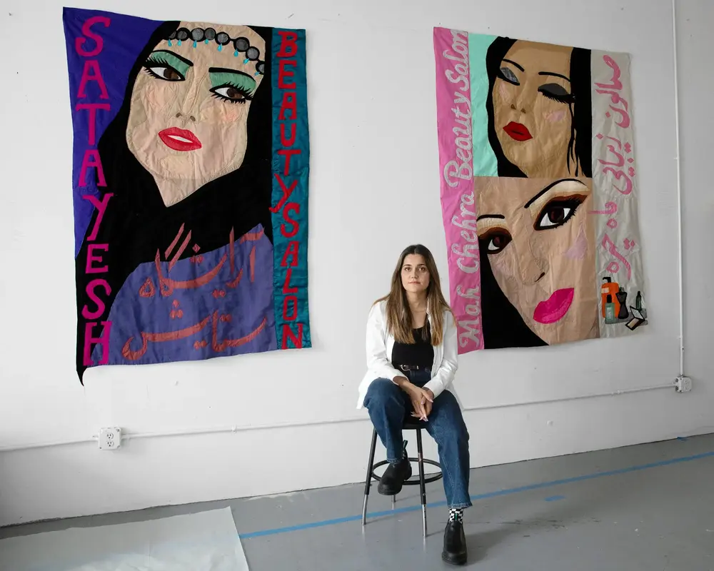 As a child, “I didn’t grow up with a pencil or a brush in my hand,” Amiri said. “We were a poor immigrant family. The only thing we had was fabric and two sticks, so we would sew little dolls. That’s my foundational material and activity.” Her mother also sewed, and an uncle in Kabul was a tailor.