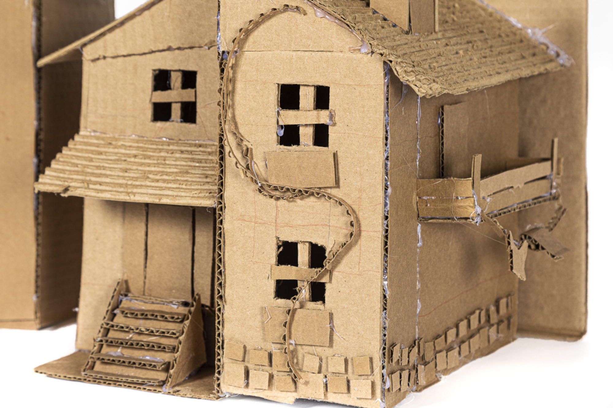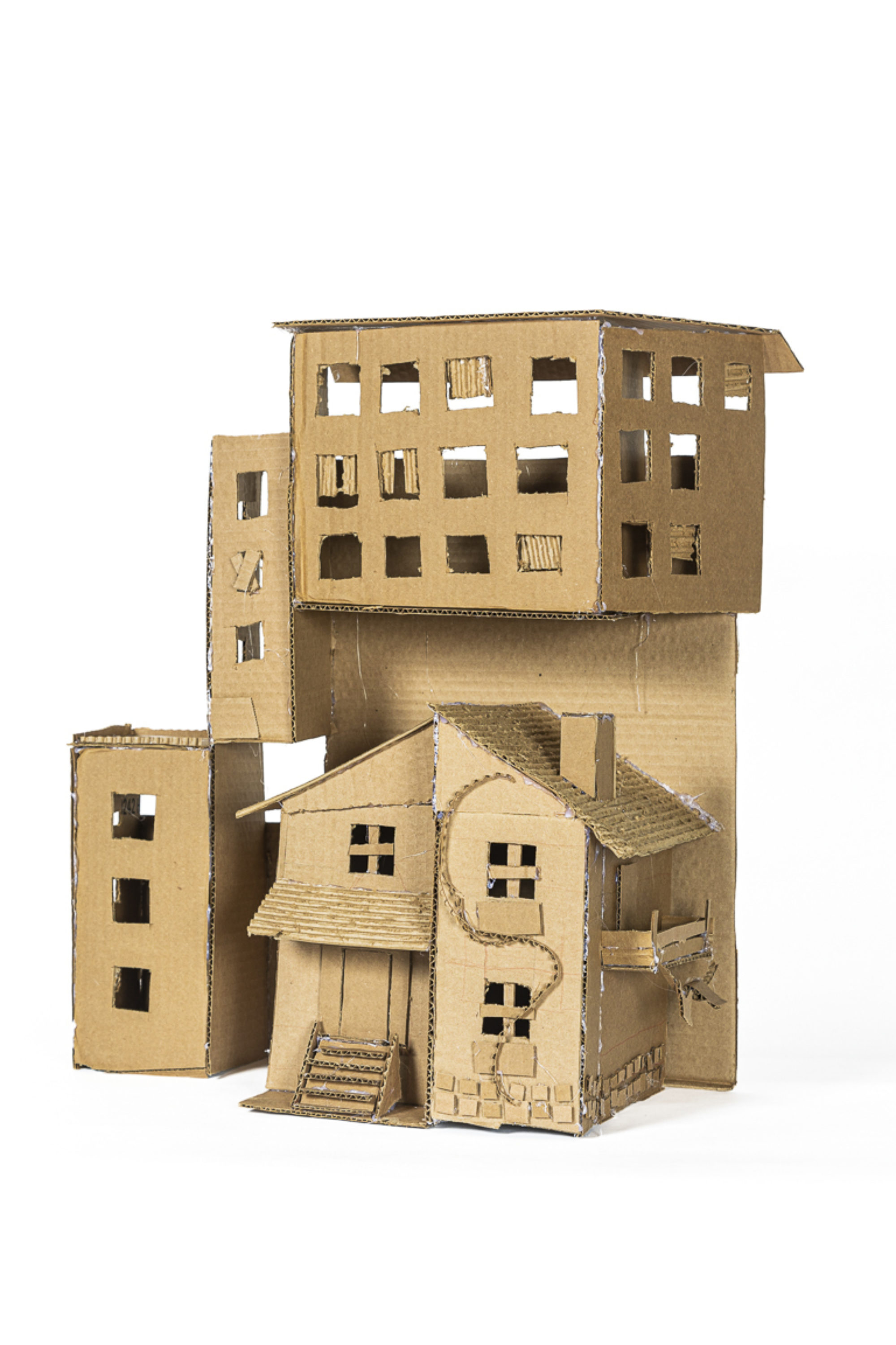 This project was inspired by the works of Hugo McCloud and Lucia Hierro, whose pieces were displayed in an exhibition at The Aldrich. As a group, we walked through each room and collectively analyzed their works. Some concepts centered on the experiences of American immigrants from around the world, thus prompting us to focus on the subject as well. As a group, we brainstormed the extent to which we would investigate the immigrant experience and decided on interviewing an immigrant and creating a piece complimentary to the audio. In doing so, it forced us to think interpretatively about how that person might have felt as a foreigner in a new country. The interviews were intended to give the audience a greater understanding of the inspiration behind our pieces. I spoke to my mother who is a Portuguese immigrant but ultimately interviewed my grandmother who revealed to me more deeply the struggles of immigrating to a new country. Next, we used cardboard as our medium to create sculptures each individually different, and were assisted by sculptor John O'Donnell who provided tips and tricks for our works. In the end, each person's final piece was a different perspective of the immigrant experience. In my sculpture, I tried to convey the overwhelming feeling of moving to an unknown and more modernized community. The main house is modeled after traditional Portuguese architecture, while the buildings engulfing it are less distinct in detail to convey a more uncertain future. In Portugal, drying machines are uncommon, so the majority of the population dries their clothing outside, hence the clothing line attached to the veranda. The tiles surrounding the walls of the house are azulejos, which are traditionally painted ceramic tiles that are a common decoration in every building. Creating these small details was very tedious, but I am proud of the work I was able to display.