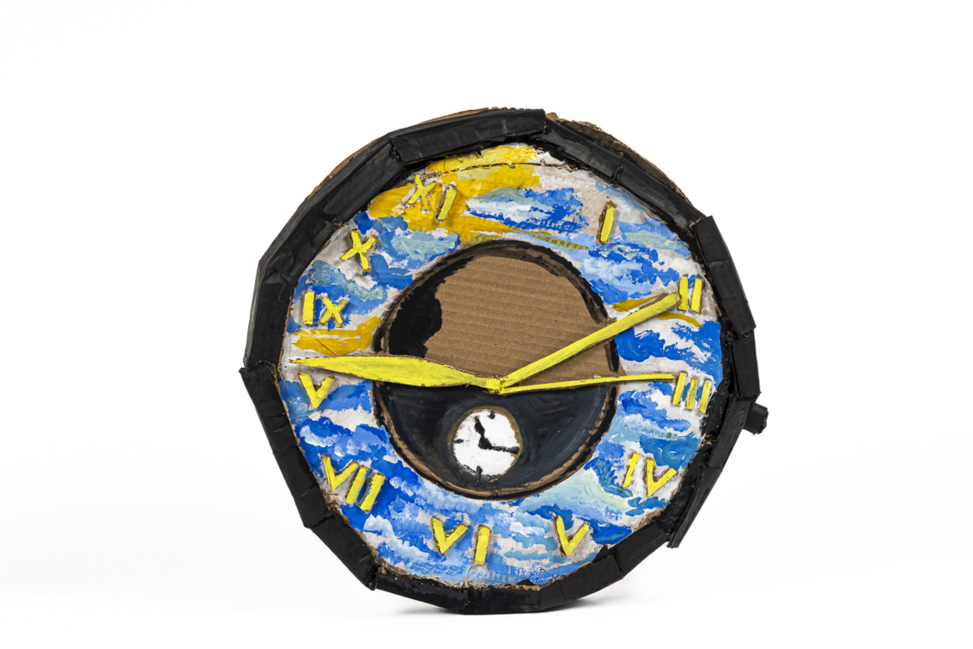 I approached the watch in a slightly difficult way, now that I have the hindsight to assess my work, and I think using cardboard to make a circular shape with curves that need to stay in place was really tricky. The hot glue would not really hold the curve of the watch, and that was probably the hardest part of making the sculpture. Other than that, I had a lot of fun working at such a large scale and bending the cardboard to make interesting shapes. I decided to paint the watch face as a sky, which I remember was the first symbol of a new life in America.