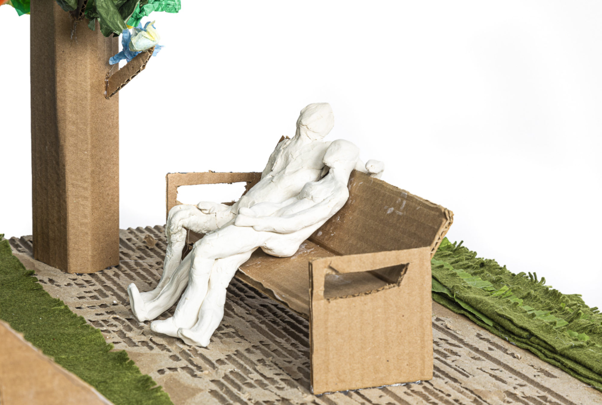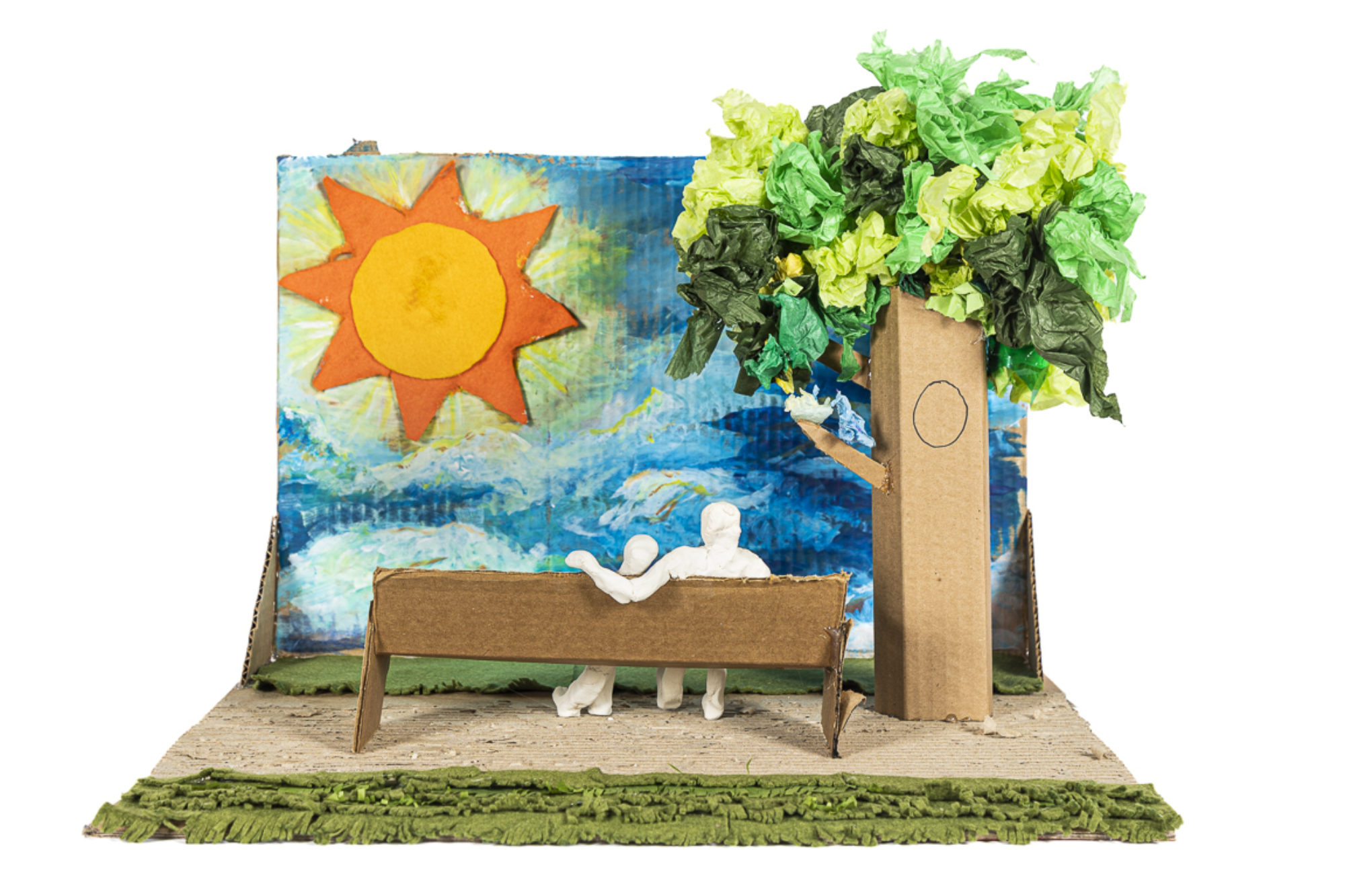 I used cardboard, acrylic paint, felt, tissue paper, acetate, and modeling clay to construct my piece. The rhythmic process of cutting, sculpting, and painting allowed me to work with focus and efficiency for 2–3 meetings. As in McCloud’s pounded tar paper, I incorporated my own emotions into my project, when I was clipping fringes into the felt for the grass. I remember Tara pointed out that I looked pretty relaxed and somewhat nostalgic. And she was right. As I was working, I was lost in pleasant old memories of my grandpa and I going for long walks. He would teach me the brand names of cars as they passed. Of course, the focus of the project is centered on the life of my great great grandfather Moishe. But my grandpa plays just as important of a role as a liaison to the past, as he knew Moishe and several other of my ancestors.